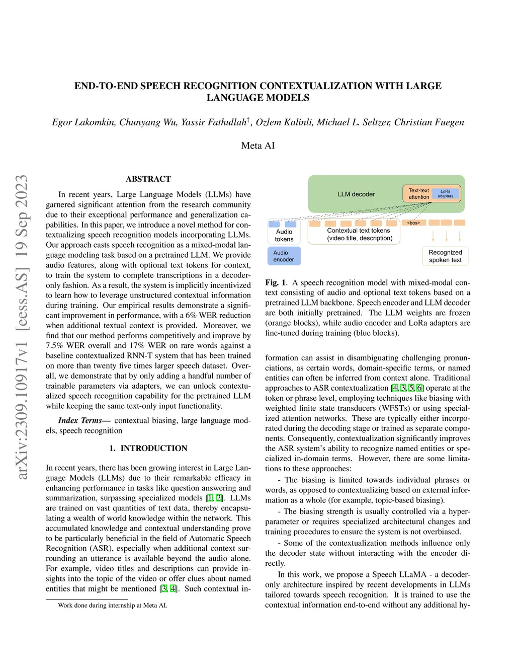In recent years, Large Language Models (LLMs) have garnered significant attention from the research community due to their exceptional performance and generalization capabilities. In this paper, we introduce a novel method for contextualizing speech recognition models incorporating LLMs. Our approach casts speech recognition as a mixed-modal language modeling task based on a pretrained LLM. We provide audio features, along with optional text tokens for context, to train the system to complete transcriptions in a decoder-only fashion. As a result, the system is implicitly incentivized to learn how to leverage unstructured contextual information during training. Our empirical results demonstrate a significant improvement in performance, with a 6% WER reduction when additional textual context is provided. Moreover, we find that our method performs competitively and improve by 7.5% WER overall and 17% WER on rare words against a baseline contextualized RNN-T system that has been trained on more than twenty five times larger speech dataset. Overall, we demonstrate that by only adding a handful number of trainable parameters via adapters, we can unlock contextualized speech recognition capability for the pretrained LLM while keeping the same text-only input functionality.