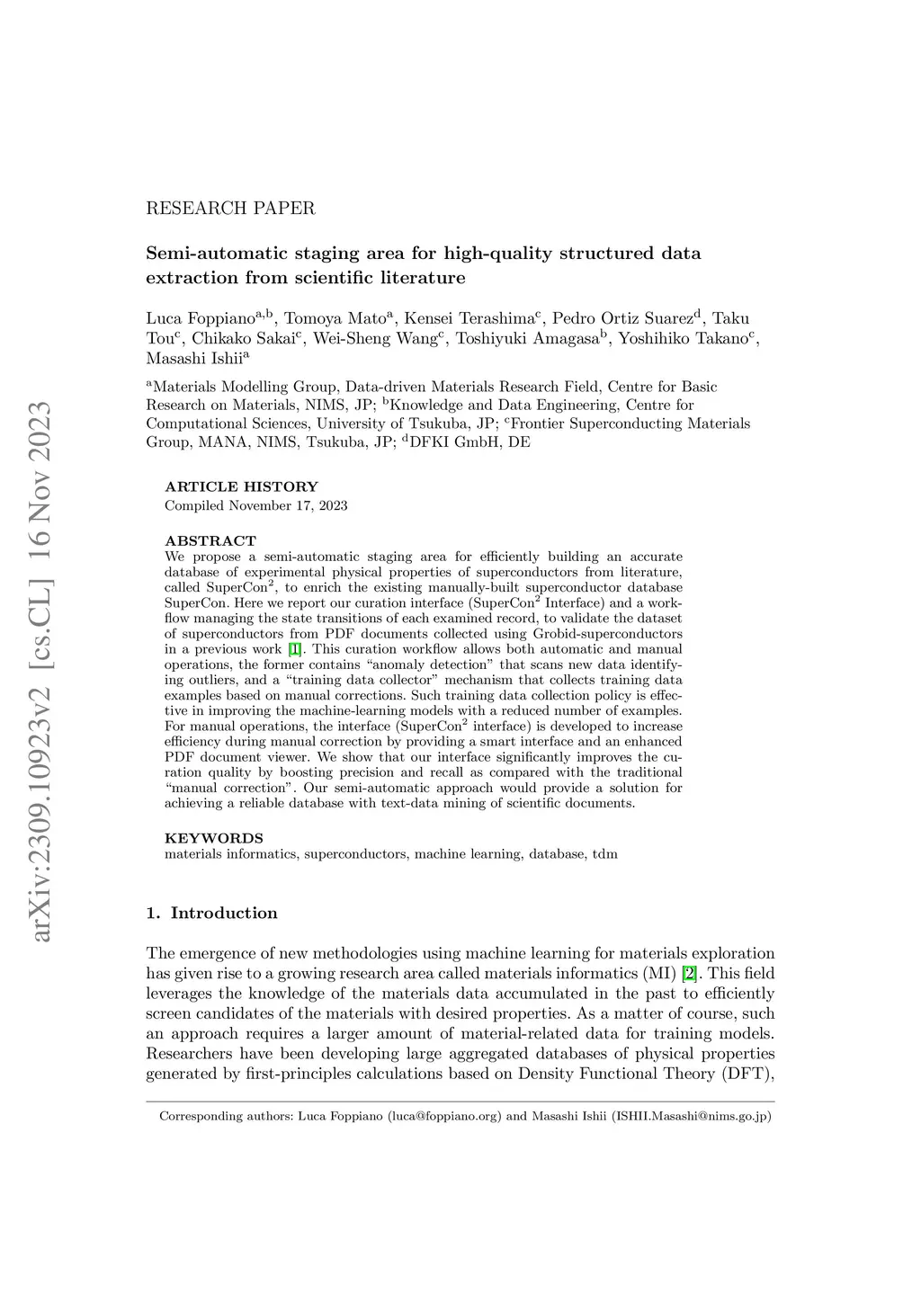We propose a semi-automatic staging area for efficiently building an accurate database of experimental physical properties of superconductors from literature, called SuperCon2, to enrich the existing manually-built superconductor database SuperCon. Here we report our curation interface (SuperCon2 Interface) and a workflow managing the state transitions of each examined record, to validate the dataset of superconductors from PDF documents collected using Grobid-superconductors in a previous work. This curation workflow allows both automatic and manual operations, the former contains ``anomaly detection'' that scans new data identifying outliers, and a ``training data collector'' mechanism that collects training data examples based on manual corrections. Such training data collection policy is effective in improving the machine-learning models with a reduced number of examples. For manual operations, the interface (SuperCon2 interface) is developed to increase efficiency during manual correction by providing a smart interface and an enhanced PDF document viewer. We show that our interface significantly improves the curation quality by boosting precision and recall as compared with the traditional ``manual correction''. Our semi-automatic approach would provide a solution for achieving a reliable database with text-data mining of scientific documents.