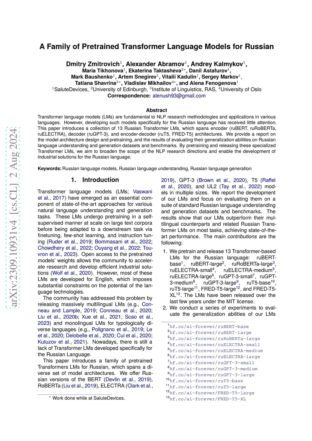 Transformer language models (LMs) are fundamental to NLP research methodologies and applications in various languages. However, developing such models specifically for the Russian language has received little attention. This paper introduces a collection of 13 Russian Transformer LMs, which spans encoder (ruBERT, ruRoBERTa, ruELECTRA), decoder (ruGPT-3), and encoder-decoder (ruT5, FRED-T5) architectures. We provide a report on the model architecture design and pretraining, and the results of evaluating their generalization abilities on Russian language understanding and generation datasets and benchmarks. By pretraining and releasing these specialized Transformer LMs, we aim to broaden the scope of the NLP research directions and enable the development of industrial solutions for the Russian language.