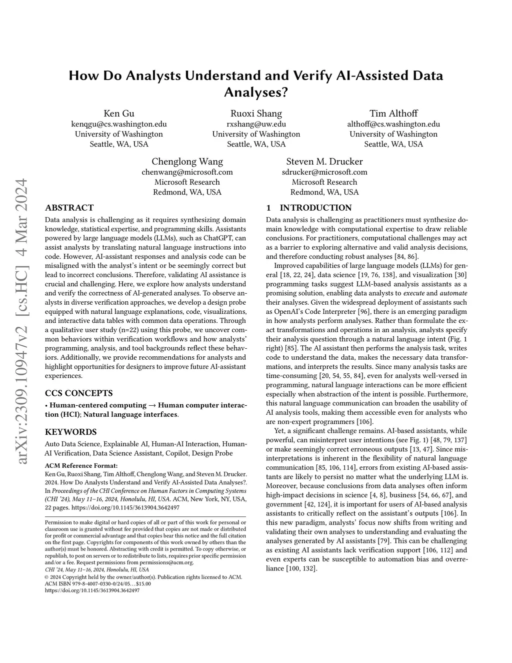 Data analysis is challenging as it requires synthesizing domain knowledge, statistical expertise, and programming skills. Assistants powered by large language models (LLMs), such as ChatGPT, can assist analysts by translating natural language instructions into code. However, AI-assistant responses and analysis code can be misaligned with the analyst's intent or be seemingly correct but lead to incorrect conclusions. Therefore, validating AI assistance is crucial and challenging. Here, we explore how analysts understand and verify the correctness of AI-generated analyses. To observe analysts in diverse verification approaches, we develop a design probe equipped with natural language explanations, code, visualizations, and interactive data tables with common data operations. Through a qualitative user study (n=22) using this probe, we uncover common behaviors within verification workflows and how analysts' programming, analysis, and tool backgrounds reflect these behaviors. Additionally, we provide recommendations for analysts and highlight opportunities for designers to improve future AI-assistant experiences.