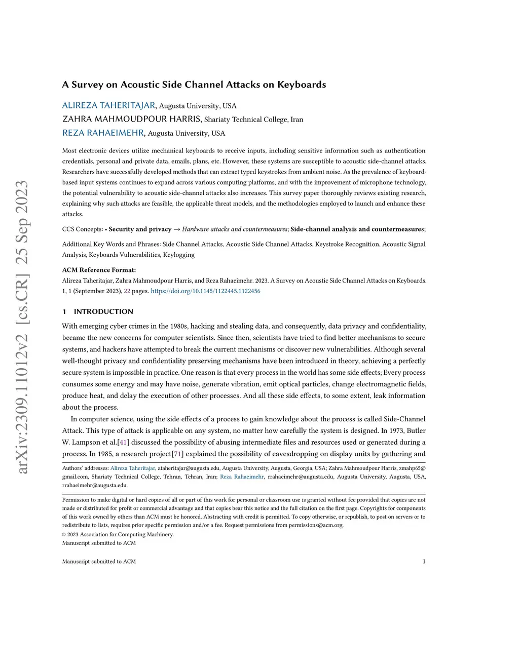 A Survey on Acoustic Side Channel Attacks on Keyboards