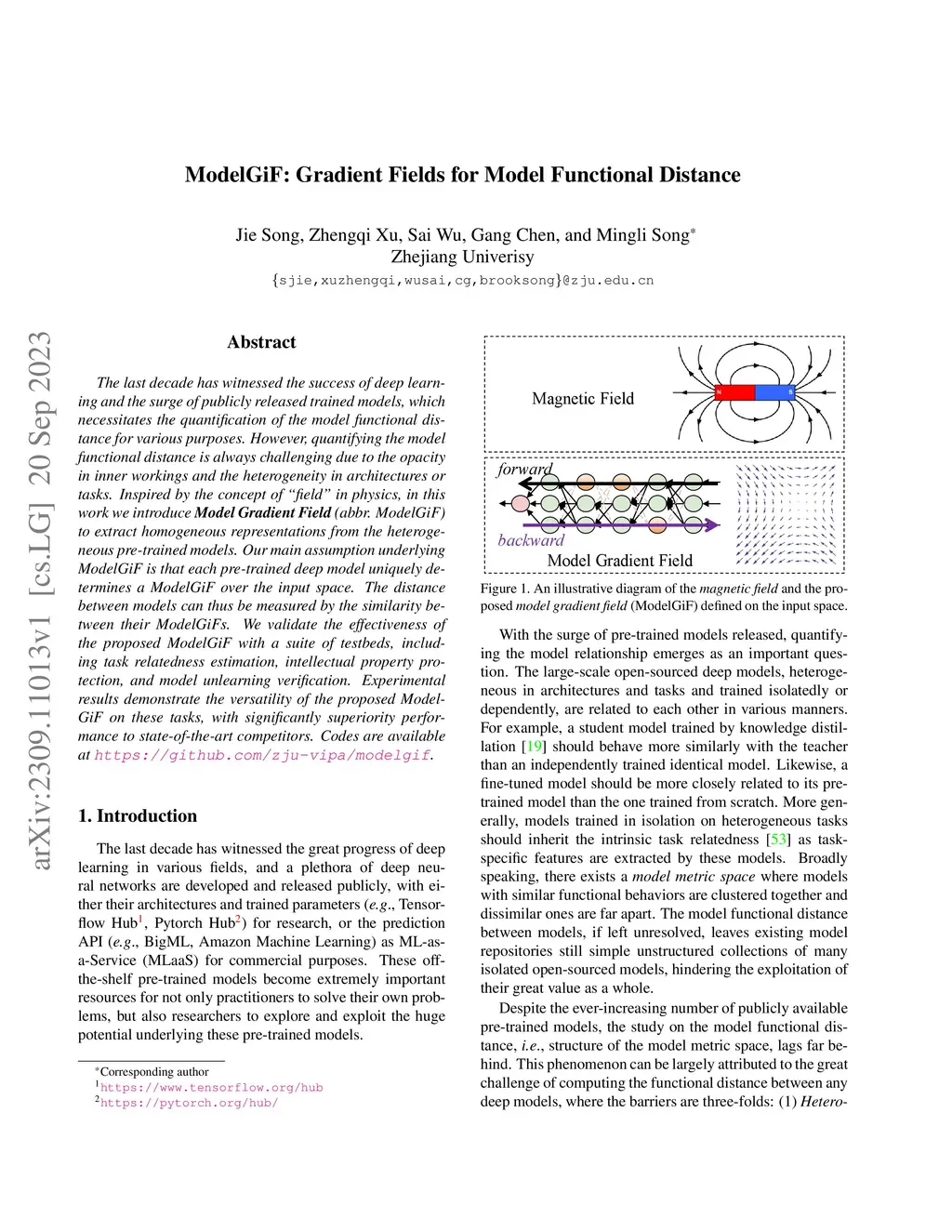 The last decade has witnessed the success of deep learning and the surge of publicly released trained models, which necessitates the quantification of the model functional distance for various purposes. However, quantifying the model functional distance is always challenging due to the opacity in inner workings and the heterogeneity in architectures or tasks. Inspired by the concept of "field" in physics, in this work we introduce Model Gradient Field (abbr. ModelGiF) to extract homogeneous representations from the heterogeneous pre-trained models. Our main assumption underlying ModelGiF is that each pre-trained deep model uniquely determines a ModelGiF over the input space. The distance between models can thus be measured by the similarity between their ModelGiFs. We validate the effectiveness of the proposed ModelGiF with a suite of testbeds, including task relatedness estimation, intellectual property protection, and model unlearning verification. Experimental results demonstrate the versatility of the proposed ModelGiF on these tasks, with significantly superiority performance to state-of-the-art competitors. Codes are available at https://github.com/zju-vipa/modelgif.