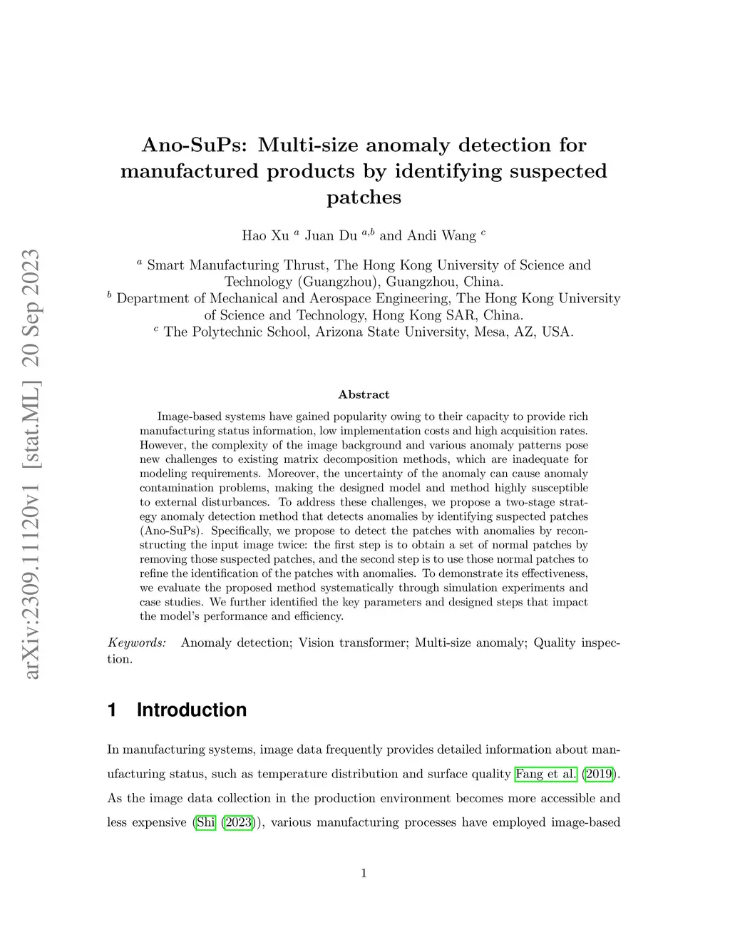 Ano-SuPs: Multi-size anomaly detection for manufactured products by identifying suspected patches