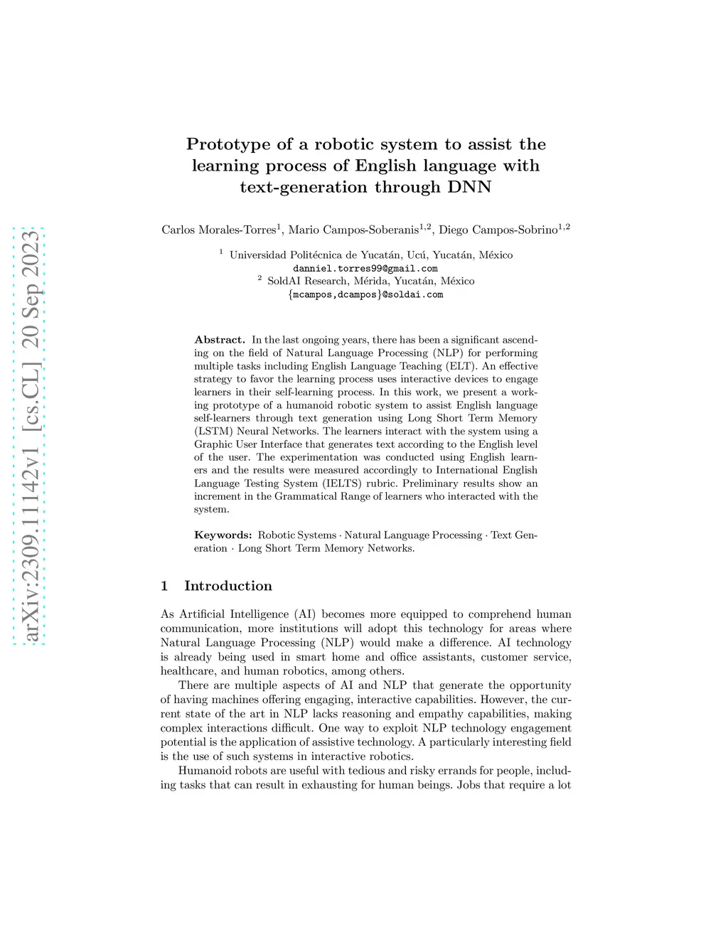 In the last ongoing years, there has been a significant ascending on the field of Natural Language Processing (NLP) for performing multiple tasks including English Language Teaching (ELT). An effective strategy to favor the learning process uses interactive devices to engage learners in their self-learning process. In this work, we present a working prototype of a humanoid robotic system to assist English language self-learners through text generation using Long Short Term Memory (LSTM) Neural Networks. The learners interact with the system using a Graphic User Interface that generates text according to the English level of the user. The experimentation was conducted using English learners and the results were measured accordingly to International English Language Testing System (IELTS) rubric. Preliminary results show an increment in the Grammatical Range of learners who interacted with the system.