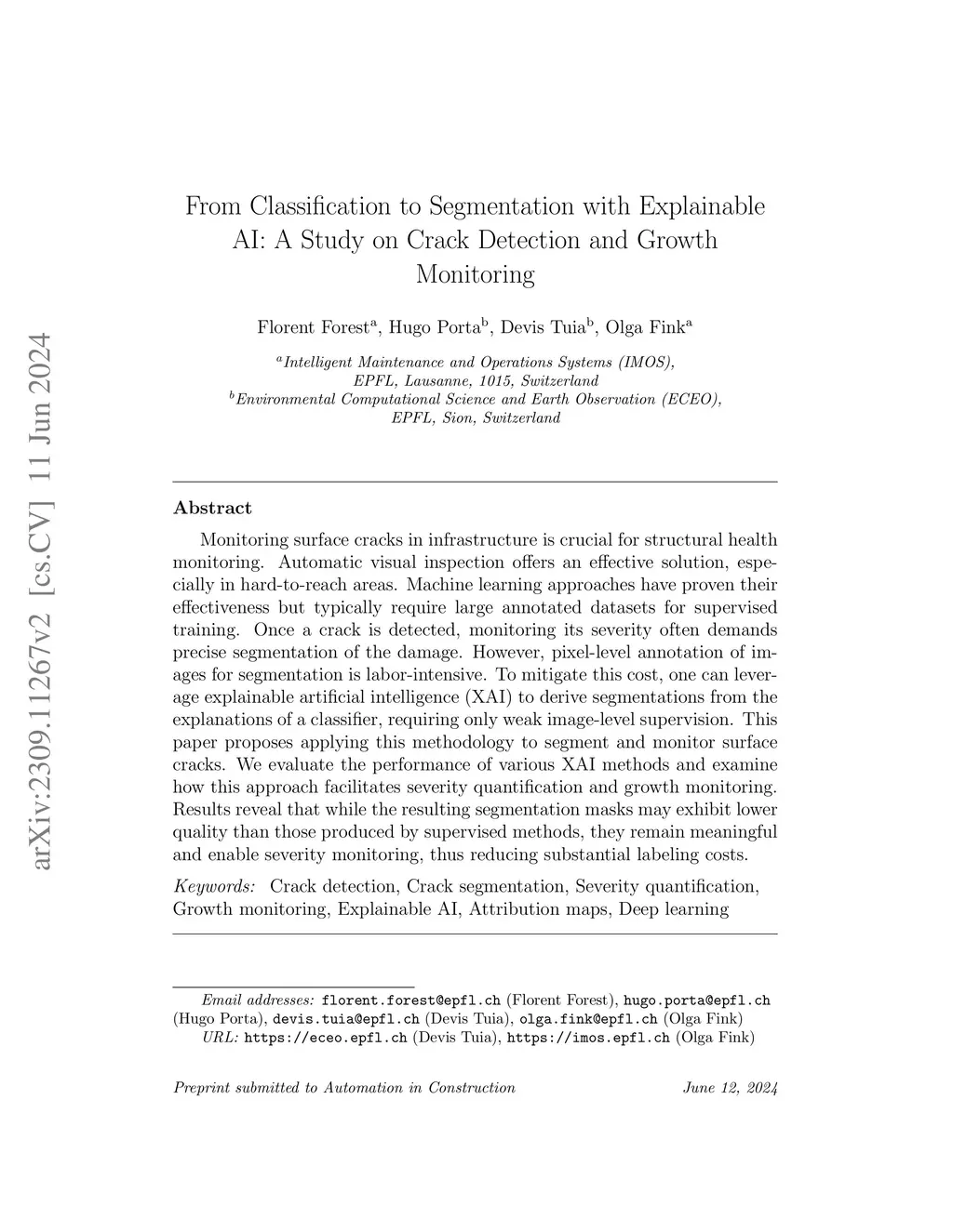 Monitoring surface cracks in infrastructure is crucial for structural health monitoring. Automatic visual inspection offers an effective solution, especially in hard-to-reach areas. Machine learning approaches have proven their effectiveness but typically require large annotated datasets for supervised training. Once a crack is detected, monitoring its severity often demands precise segmentation of the damage. However, pixel-level annotation of images for segmentation is labor-intensive. To mitigate this cost, one can leverage explainable artificial intelligence (XAI) to derive segmentations from the explanations of a classifier, requiring only weak image-level supervision. This paper proposes applying this methodology to segment and monitor surface cracks. We evaluate the performance of various XAI methods and examine how this approach facilitates severity quantification and growth monitoring. Results reveal that while the resulting segmentation masks may exhibit lower quality than those produced by supervised methods, they remain meaningful and enable severity monitoring, thus reducing substantial labeling costs.