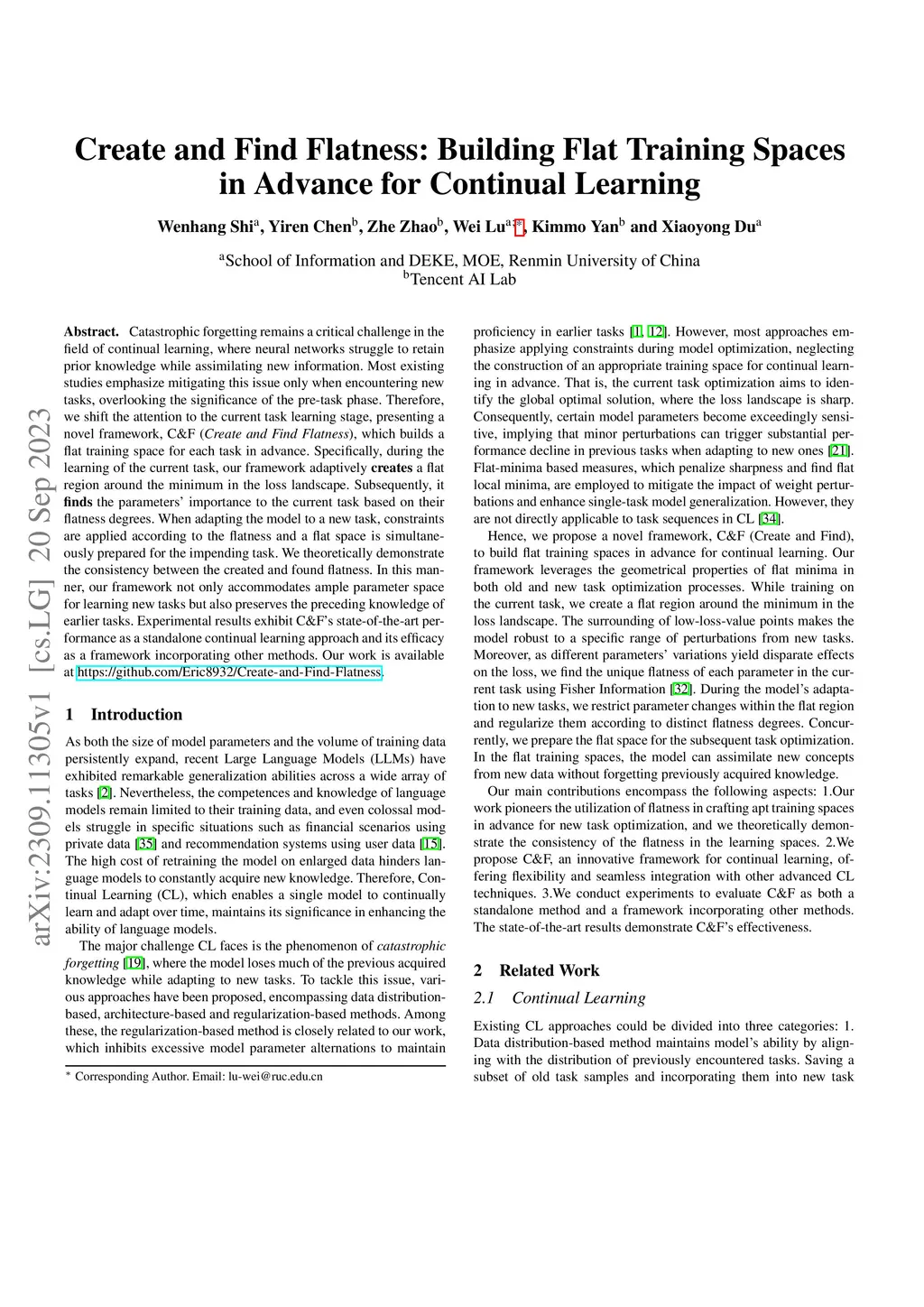 Catastrophic forgetting remains a critical challenge in the field of continual learning, where neural networks struggle to retain prior knowledge while assimilating new information. Most existing studies emphasize mitigating this issue only when encountering new tasks, overlooking the significance of the pre-task phase. Therefore, we shift the attention to the current task learning stage, presenting a novel framework, C&F (Create and Find Flatness), which builds a flat training space for each task in advance. Specifically, during the learning of the current task, our framework adaptively creates a flat region around the minimum in the loss landscape. Subsequently, it finds the parameters' importance to the current task based on their flatness degrees. When adapting the model to a new task, constraints are applied according to the flatness and a flat space is simultaneously prepared for the impending task. We theoretically demonstrate the consistency between the created and found flatness. In this manner, our framework not only accommodates ample parameter space for learning new tasks but also preserves the preceding knowledge of earlier tasks. Experimental results exhibit C&F's state-of-the-art performance as a standalone continual learning approach and its efficacy as a framework incorporating other methods. Our work is available at https://github.com/Eric8932/Create-and-Find-Flatness.