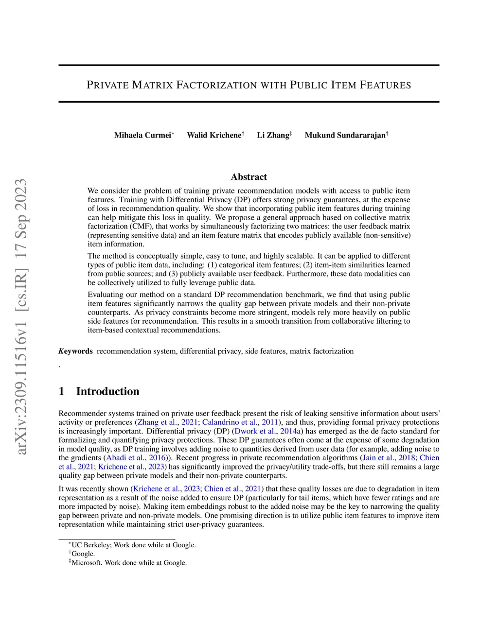 We consider the problem of training private recommendation models with access to public item features. Training with Differential Privacy (DP) offers strong privacy guarantees, at the expense of loss in recommendation quality. We show that incorporating public item features during training can help mitigate this loss in quality. We propose a general approach based on collective matrix factorization (CMF), that works by simultaneously factorizing two matrices: the user feedback matrix (representing sensitive data) and an item feature matrix that encodes publicly available (non-sensitive) item information. The method is conceptually simple, easy to tune, and highly scalable. It can be applied to different types of public item data, including: (1) categorical item features; (2) item-item similarities learned from public sources; and (3) publicly available user feedback. Furthermore, these data modalities can be collectively utilized to fully leverage public data. Evaluating our method on a standard DP recommendation benchmark, we find that using public item features significantly narrows the quality gap between private models and their non-private counterparts. As privacy constraints become more stringent, models rely more heavily on public side features for recommendation. This results in a smooth transition from collaborative filtering to item-based contextual recommendations.