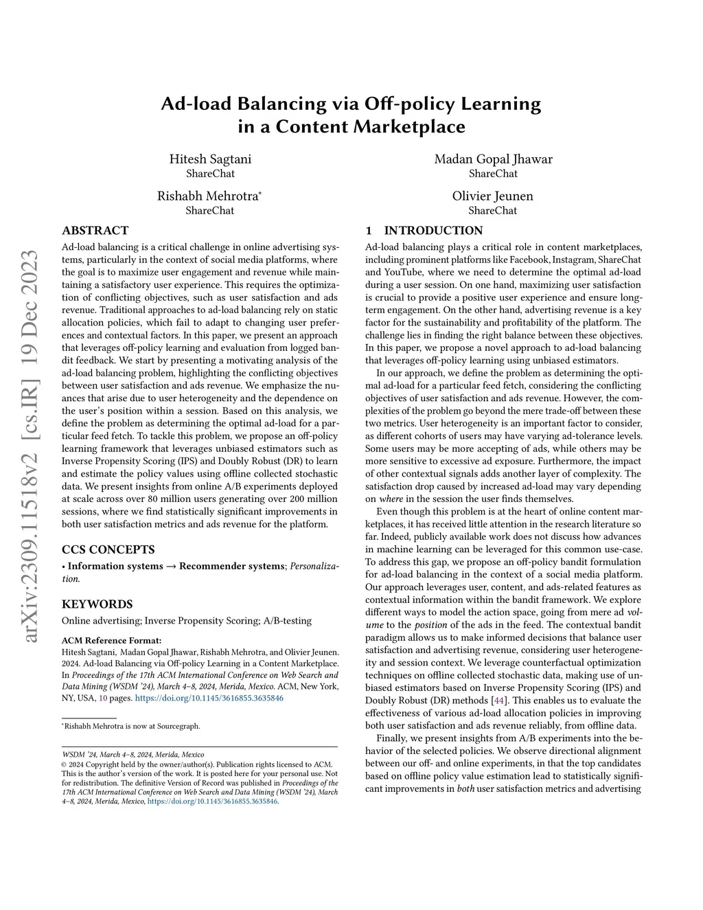 Ad-load Balancing via Off-policy Learning in a Content Marketplace