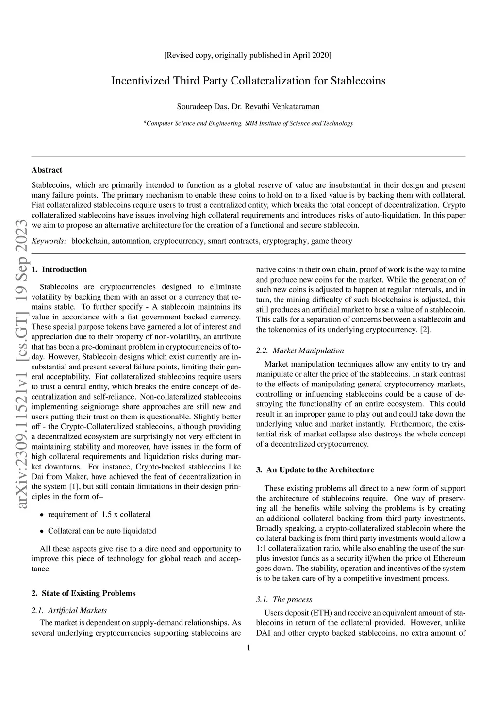 Stablecoins, which are primarily intended to function as a global reserve of value are insubstantial in their design and present many failure points. The primary mechanism to enable these coins to hold on to a fixed value is by backing them with collateral. Fiat collateralized stablecoins require users to trust a centralized entity, which breaks the total concept of decentralization. Crypto collateralized stablecoins have issues involving high collateral requirements and introduces risks of auto-liquidation. In this paper we aim to propose an alternative architecture for the creation of a functional and secure stablecoin.