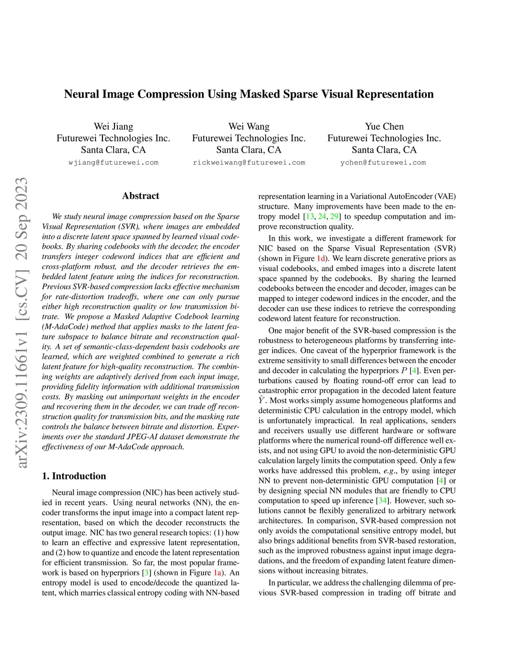 Neural Image Compression Using Masked Sparse Visual Representation