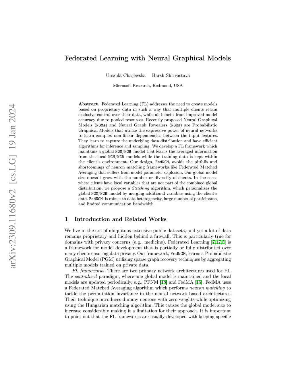 Federated Learning (FL) addresses the need to create models based on proprietary data in such a way that multiple clients retain exclusive control over their data, while all benefit from improved model accuracy due to pooled resources. Recently proposed Neural Graphical Models (NGMs) are Probabilistic Graphical models that utilize the expressive power of neural networks to learn complex non-linear dependencies between the input features. They learn to capture the underlying data distribution and have efficient algorithms for inference and sampling. We develop a FL framework which maintains a global NGM model that learns the averaged information from the local NGM models while keeping the training data within the client's environment. Our design, FedNGMs, avoids the pitfalls and shortcomings of neuron matching frameworks like Federated Matched Averaging that suffers from model parameter explosion. Our global model size remains constant throughout the process. In the cases where clients have local variables that are not part of the combined global distribution, we propose a `Stitching' algorithm, which personalizes the global NGM models by merging the additional variables using the client's data. FedNGM is robust to data heterogeneity, large number of participants, and limited communication bandwidth.