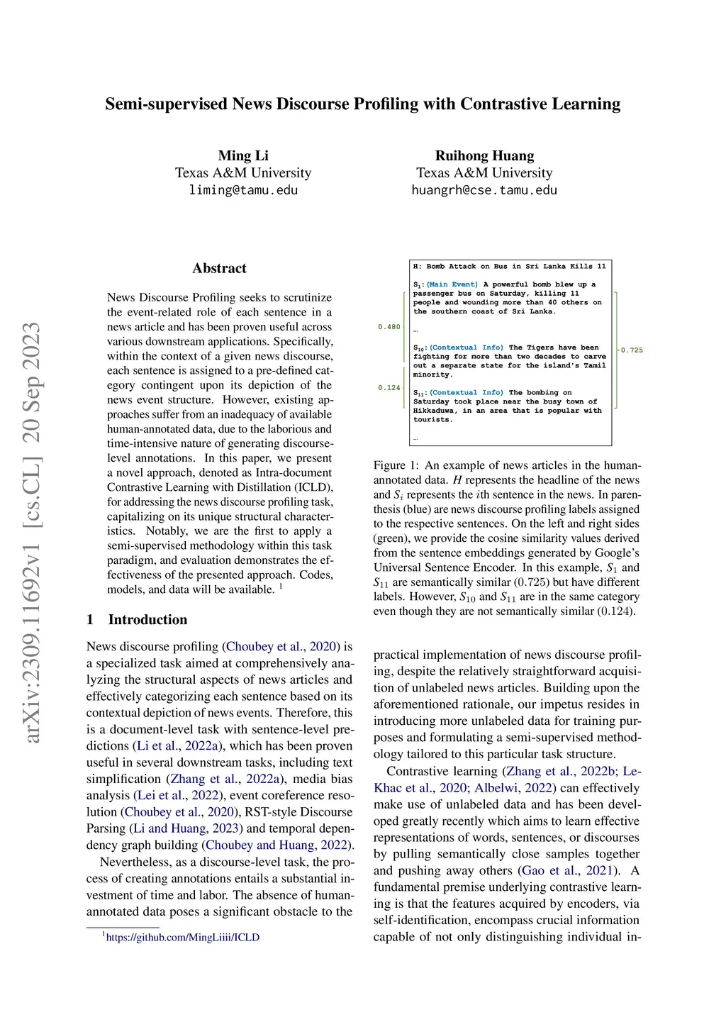 Semi-supervised News Discourse Profiling with Contrastive Learning