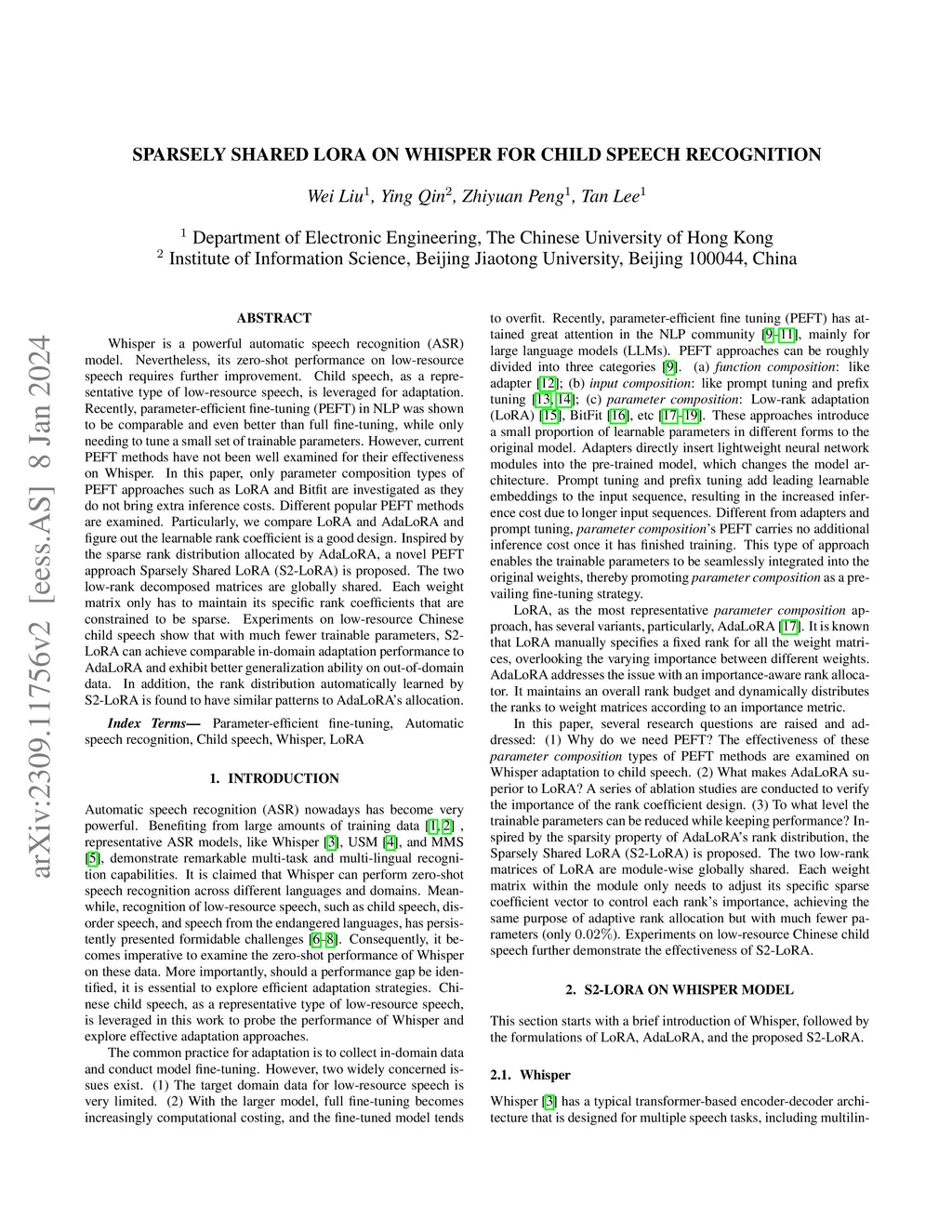 Whisper is a powerful automatic speech recognition (ASR) model. Nevertheless, its zero-shot performance on low-resource speech requires further improvement. Child speech, as a representative type of low-resource speech, is leveraged for adaptation. Recently, parameter-efficient fine-tuning (PEFT) in NLP was shown to be comparable and even better than full fine-tuning, while only needing to tune a small set of trainable parameters. However, current PEFT methods have not been well examined for their effectiveness on Whisper. In this paper, only parameter composition types of PEFT approaches such as LoRA and Bitfit are investigated as they do not bring extra inference costs. Different popular PEFT methods are examined. Particularly, we compare LoRA and AdaLoRA and figure out the learnable rank coefficient is a good design. Inspired by the sparse rank distribution allocated by AdaLoRA, a novel PEFT approach Sparsely Shared LoRA (S2-LoRA) is proposed. The two low-rank decomposed matrices are globally shared. Each weight matrix only has to maintain its specific rank coefficients that are constrained to be sparse. Experiments on low-resource Chinese child speech show that with much fewer trainable parameters, S2-LoRA can achieve comparable in-domain adaptation performance to AdaLoRA and exhibit better generalization ability on out-of-domain data. In addition, the rank distribution automatically learned by S2-LoRA is found to have similar patterns to AdaLoRA's allocation.
