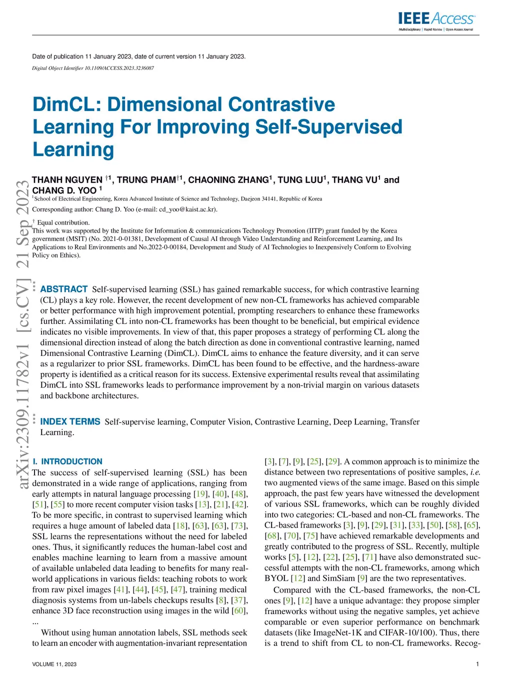 Self-supervised learning (SSL) has gained remarkable success, for which contrastive learning (CL) plays a key role. However, the recent development of new non-CL frameworks has achieved comparable or better performance with high improvement potential, prompting researchers to enhance these frameworks further. Assimilating CL into non-CL frameworks has been thought to be beneficial, but empirical evidence indicates no visible improvements. In view of that, this paper proposes a strategy of performing CL along the dimensional direction instead of along the batch direction as done in conventional contrastive learning, named Dimensional Contrastive Learning (DimCL). DimCL aims to enhance the feature diversity, and it can serve as a regularizer to prior SSL frameworks. DimCL has been found to be effective, and the hardness-aware property is identified as a critical reason for its success. Extensive experimental results reveal that assimilating DimCL into SSL frameworks leads to performance improvement by a non-trivial margin on various datasets and backbone architectures.