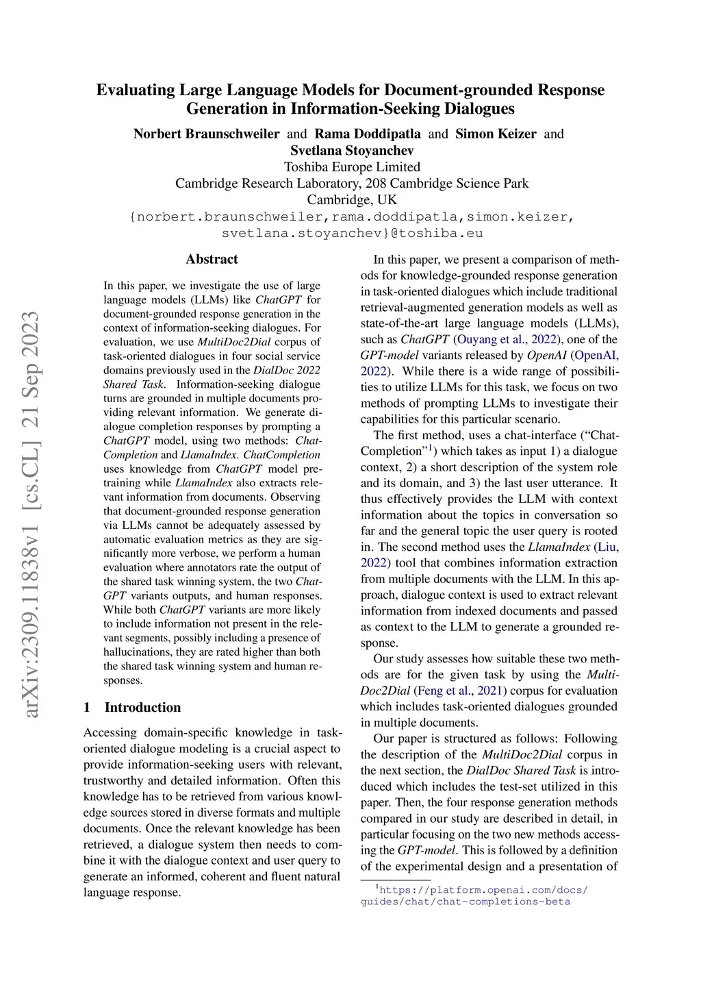 In this paper, we investigate the use of large language models (LLMs) like ChatGPT for document-grounded response generation in the context of information-seeking dialogues. For evaluation, we use the MultiDoc2Dial corpus of task-oriented dialogues in four social service domains previously used in the DialDoc 2022 Shared Task. Information-seeking dialogue turns are grounded in multiple documents providing relevant information. We generate dialogue completion responses by prompting a ChatGPT model, using two methods: Chat-Completion and LlamaIndex. ChatCompletion uses knowledge from ChatGPT model pretraining while LlamaIndex also extracts relevant information from documents. Observing that document-grounded response generation via LLMs cannot be adequately assessed by automatic evaluation metrics as they are significantly more verbose, we perform a human evaluation where annotators rate the output of the shared task winning system, the two Chat-GPT variants outputs, and human responses. While both ChatGPT variants are more likely to include information not present in the relevant segments, possibly including a presence of hallucinations, they are rated higher than both the shared task winning system and human responses.
