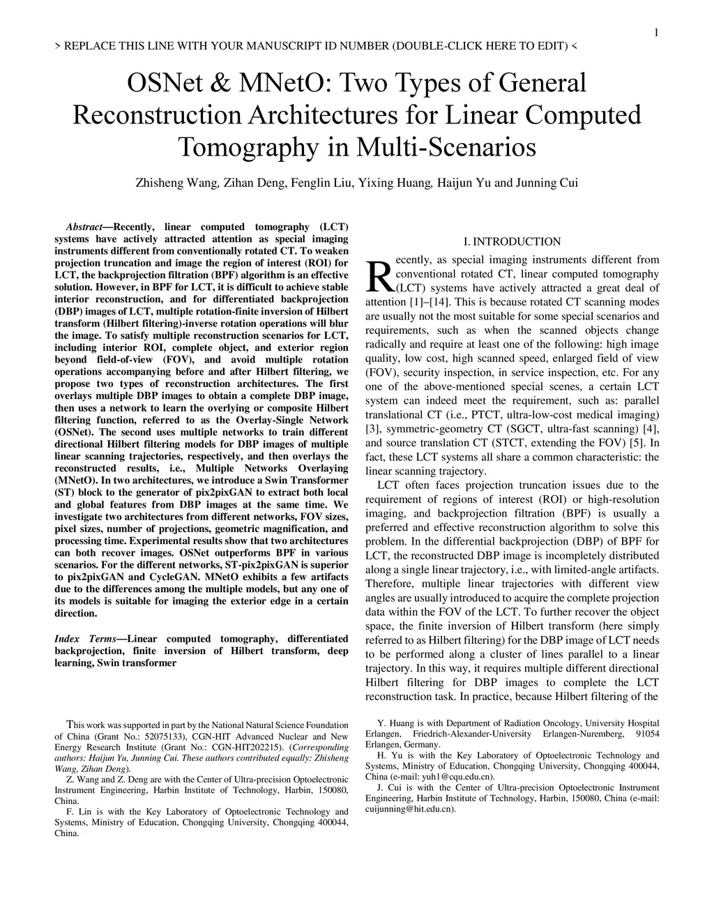 Recently, linear computed tomography (LCT) systems have actively attracted attention. To weaken projection truncation and image the region of interest (ROI) for LCT, the backprojection filtration (BPF) algorithm is an effective solution. However, in BPF for LCT, it is difficult to achieve stable interior reconstruction, and for differentiated backprojection (DBP) images of LCT, multiple rotation-finite inversion of Hilbert transform (Hilbert filtering)-inverse rotation operations will blur the image. To satisfy multiple reconstruction scenarios for LCT, including interior ROI, complete object, and exterior region beyond field-of-view (FOV), and avoid the rotation operations of Hilbert filtering, we propose two types of reconstruction architectures. The first overlays multiple DBP images to obtain a complete DBP image, then uses a network to learn the overlying Hilbert filtering function, referred to as the Overlay-Single Network (OSNet). The second uses multiple networks to train different directional Hilbert filtering models for DBP images of multiple linear scannings, respectively, and then overlays the reconstructed results, i.e., Multiple Networks Overlaying (MNetO). In two architectures, we introduce a Swin Transformer (ST) block to the generator of pix2pixGAN to extract both local and global features from DBP images at the same time. We investigate two architectures from different networks, FOV sizes, pixel sizes, number of projections, geometric magnification, and processing time. Experimental results show that two architectures can both recover images. OSNet outperforms BPF in various scenarios. For the different networks, ST-pix2pixGAN is superior to pix2pixGAN and CycleGAN. MNetO exhibits a few artifacts due to the differences among the multiple models, but any one of its models is suitable for imaging the exterior edge in a certain direction.