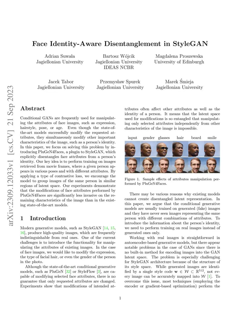 Conditional GANs are frequently used for manipulating the attributes of face images, such as expression, hairstyle, pose, or age. Even though the state-of-the-art models successfully modify the requested attributes, they simultaneously modify other important characteristics of the image, such as a person's identity. In this paper, we focus on solving this problem by introducing PluGeN4Faces, a plugin to StyleGAN, which explicitly disentangles face attributes from a person's identity. Our key idea is to perform training on images retrieved from movie frames, where a given person appears in various poses and with different attributes. By applying a type of contrastive loss, we encourage the model to group images of the same person in similar regions of latent space. Our experiments demonstrate that the modifications of face attributes performed by PluGeN4Faces are significantly less invasive on the remaining characteristics of the image than in the existing state-of-the-art models.