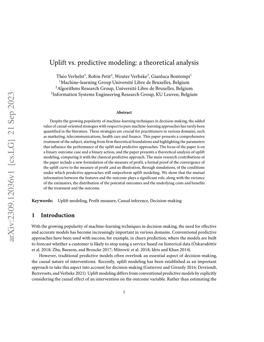 Despite the growing popularity of machine-learning techniques in decision-making, the added value of causal-oriented strategies with respect to pure machine-learning approaches has rarely been quantified in the literature. These strategies are crucial for practitioners in various domains, such as marketing, telecommunications, health care and finance. This paper presents a comprehensive treatment of the subject, starting from firm theoretical foundations and highlighting the parameters that influence the performance of the uplift and predictive approaches. The focus of the paper is on a binary outcome case and a binary action, and the paper presents a theoretical analysis of uplift modeling, comparing it with the classical predictive approach. The main research contributions of the paper include a new formulation of the measure of profit, a formal proof of the convergence of the uplift curve to the measure of profit ,and an illustration, through simulations, of the conditions under which predictive approaches still outperform uplift modeling. We show that the mutual information between the features and the outcome plays a significant role, along with the variance of the estimators, the distribution of the potential outcomes and the underlying costs and benefits of the treatment and the outcome.