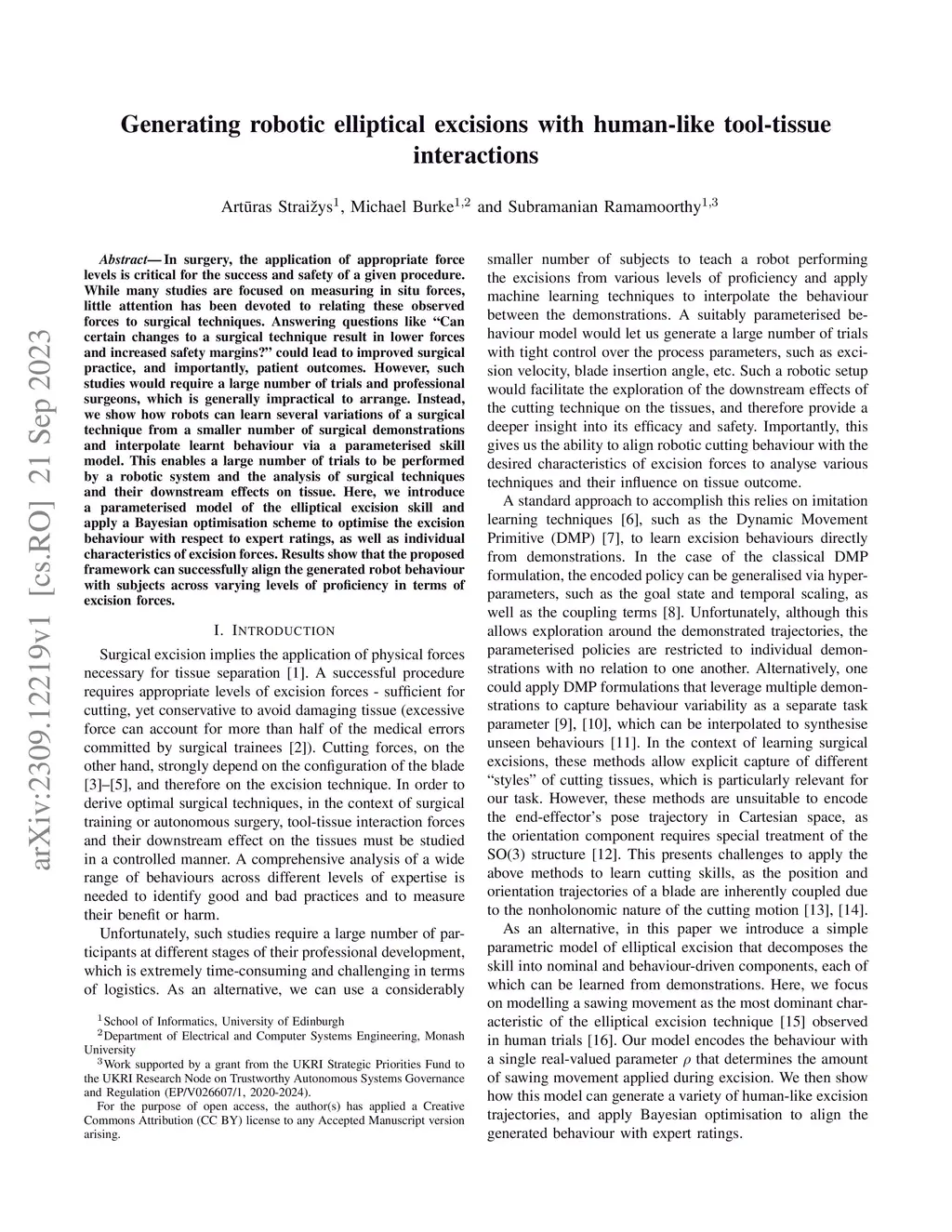 In surgery, the application of appropriate force levels is critical for the success and safety of a given procedure. While many studies are focused on measuring in situ forces, little attention has been devoted to relating these observed forces to surgical techniques. Answering questions like "Can certain changes to a surgical technique result in lower forces and increased safety margins?" could lead to improved surgical practice, and importantly, patient outcomes. However, such studies would require a large number of trials and professional surgeons, which is generally impractical to arrange. Instead, we show how robots can learn several variations of a surgical technique from a smaller number of surgical demonstrations and interpolate learnt behaviour via a parameterised skill model. This enables a large number of trials to be performed by a robotic system and the analysis of surgical techniques and their downstream effects on tissue. Here, we introduce a parameterised model of the elliptical excision skill and apply a Bayesian optimisation scheme to optimise the excision behaviour with respect to expert ratings, as well as individual characteristics of excision forces. Results show that the proposed framework can successfully align the generated robot behaviour with subjects across varying levels of proficiency in terms of excision forces.