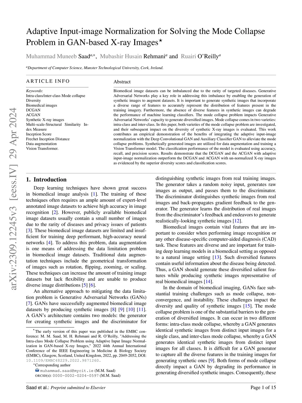 Biomedical image datasets can be imbalanced due to the rarity of targeted diseases. Generative Adversarial Networks play a key role in addressing this imbalance by enabling the generation of synthetic images to augment datasets. It is important to generate synthetic images that incorporate a diverse range of features to accurately represent the distribution of features present in the training imagery. Furthermore, the absence of diverse features in synthetic images can degrade the performance of machine learning classifiers. The mode collapse problem impacts Generative Adversarial Networks' capacity to generate diversified images. Mode collapse comes in two varieties: intra-class and inter-class. In this paper, both varieties of the mode collapse problem are investigated, and their subsequent impact on the diversity of synthetic X-ray images is evaluated. This work contributes an empirical demonstration of the benefits of integrating the adaptive input-image normalization with the Deep Convolutional GAN and Auxiliary Classifier GAN to alleviate the mode collapse problems. Synthetically generated images are utilized for data augmentation and training a Vision Transformer model. The classification performance of the model is evaluated using accuracy, recall, and precision scores. Results demonstrate that the DCGAN and the ACGAN with adaptive input-image normalization outperform the DCGAN and ACGAN with un-normalized X-ray images as evidenced by the superior diversity scores and classification scores.