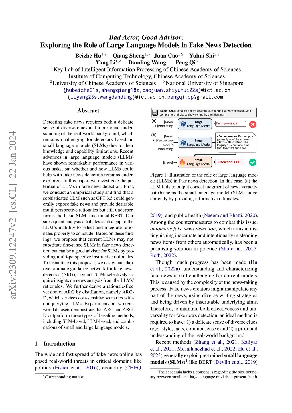 Detecting fake news requires both a delicate sense of diverse clues and a profound understanding of the real-world background, which remains challenging for detectors based on small language models (SLMs) due to their knowledge and capability limitations. Recent advances in large language models (LLMs) have shown remarkable performance in various tasks, but whether and how LLMs could help with fake news detection remains underexplored. In this paper, we investigate the potential of LLMs in fake news detection. First, we conduct an empirical study and find that a sophisticated LLM such as GPT 3.5 could generally expose fake news and provide desirable multi-perspective rationales but still underperforms the basic SLM, fine-tuned BERT. Our subsequent analysis attributes such a gap to the LLM's inability to select and integrate rationales properly to conclude. Based on these findings, we propose that current LLMs may not substitute fine-tuned SLMs in fake news detection but can be a good advisor for SLMs by providing multi-perspective instructive rationales. To instantiate this proposal, we design an adaptive rationale guidance network for fake news detection (ARG), in which SLMs selectively acquire insights on news analysis from the LLMs' rationales. We further derive a rationale-free version of ARG by distillation, namely ARG-D, which services cost-sensitive scenarios without inquiring LLMs. Experiments on two real-world datasets demonstrate that ARG and ARG-D outperform three types of baseline methods, including SLM-based, LLM-based, and combinations of small and large language models.