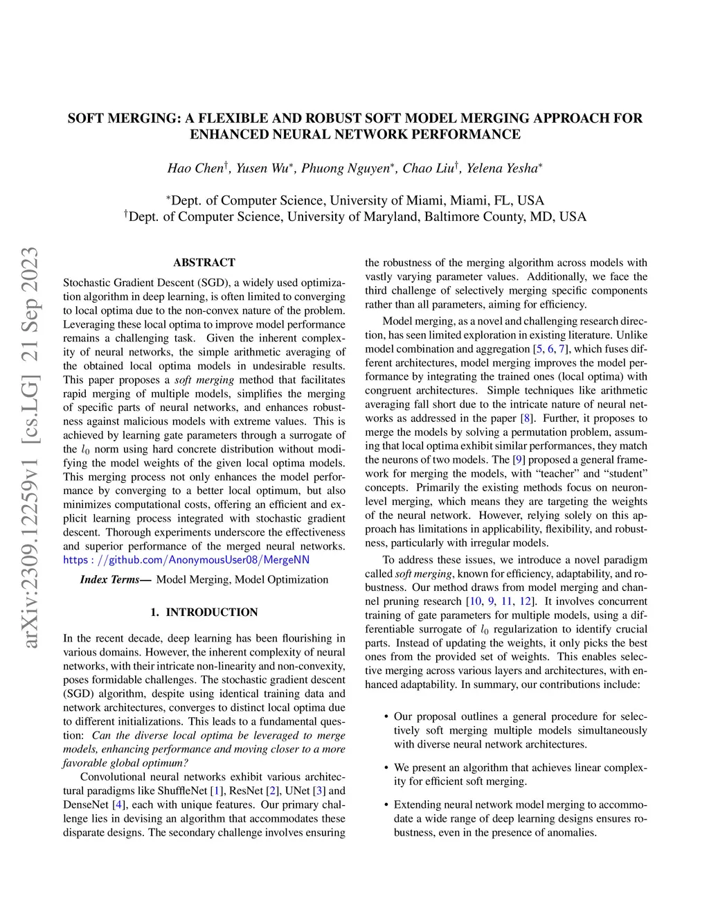 Stochastic Gradient Descent (SGD), a widely used optimization algorithm in deep learning, is often limited to converging to local optima due to the non-convex nature of the problem. Leveraging these local optima to improve model performance remains a challenging task. Given the inherent complexity of neural networks, the simple arithmetic averaging of the obtained local optima models in undesirable results. This paper proposes a {\em soft merging} method that facilitates rapid merging of multiple models, simplifies the merging of specific parts of neural networks, and enhances robustness against malicious models with extreme values. This is achieved by learning gate parameters through a surrogate of the norm using hard concrete distribution without modifying the model weights of the given local optima models. This merging process not only enhances the model performance by converging to a better local optimum, but also minimizes computational costs, offering an efficient and explicit learning process integrated with stochastic gradient descent. Thorough experiments underscore the effectiveness and superior performance of the merged neural networks.