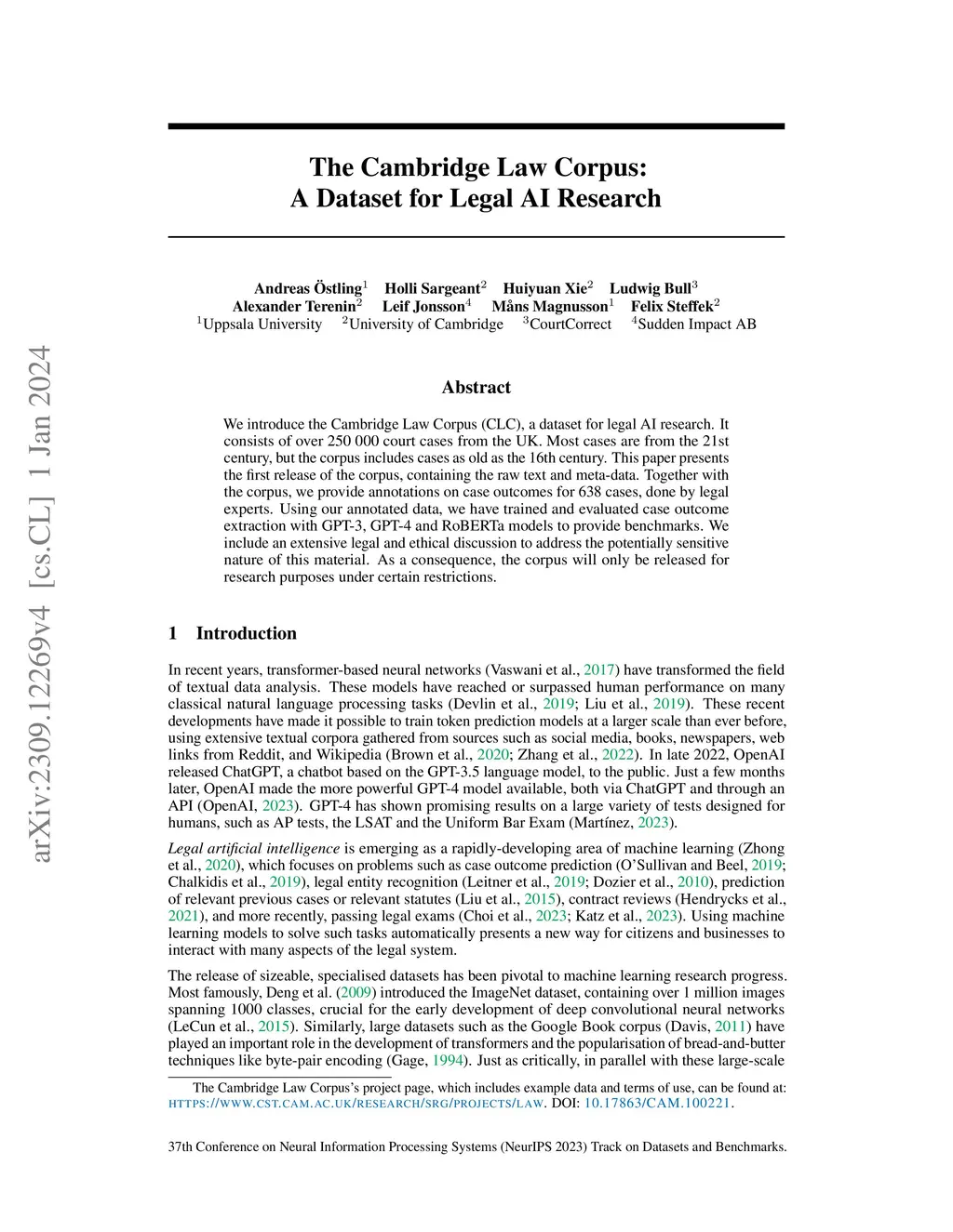 The Cambridge Law Corpus: A Dataset for Legal AI Research