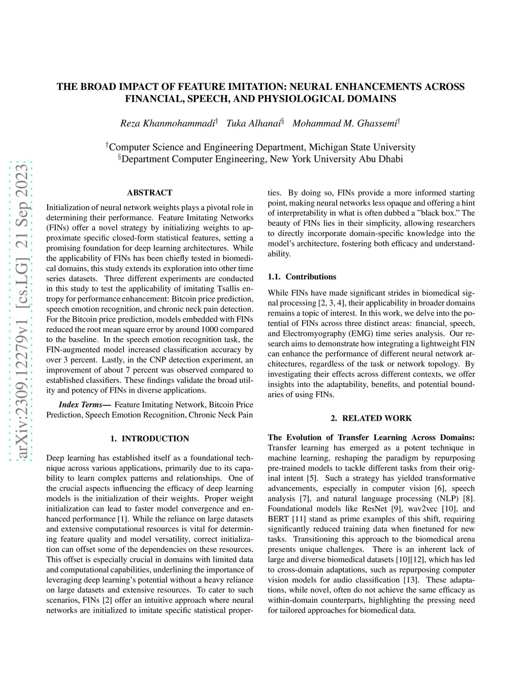 Initialization of neural network weights plays a pivotal role in determining their performance. Feature Imitating Networks (FINs) offer a novel strategy by initializing weights to approximate specific closed-form statistical features, setting a promising foundation for deep learning architectures. While the applicability of FINs has been chiefly tested in biomedical domains, this study extends its exploration into other time series datasets. Three different experiments are conducted in this study to test the applicability of imitating Tsallis entropy for performance enhancement: Bitcoin price prediction, speech emotion recognition, and chronic neck pain detection. For the Bitcoin price prediction, models embedded with FINs reduced the root mean square error by around 1000 compared to the baseline. In the speech emotion recognition task, the FIN-augmented model increased classification accuracy by over 3 percent. Lastly, in the CNP detection experiment, an improvement of about 7 percent was observed compared to established classifiers. These findings validate the broad utility and potency of FINs in diverse applications.