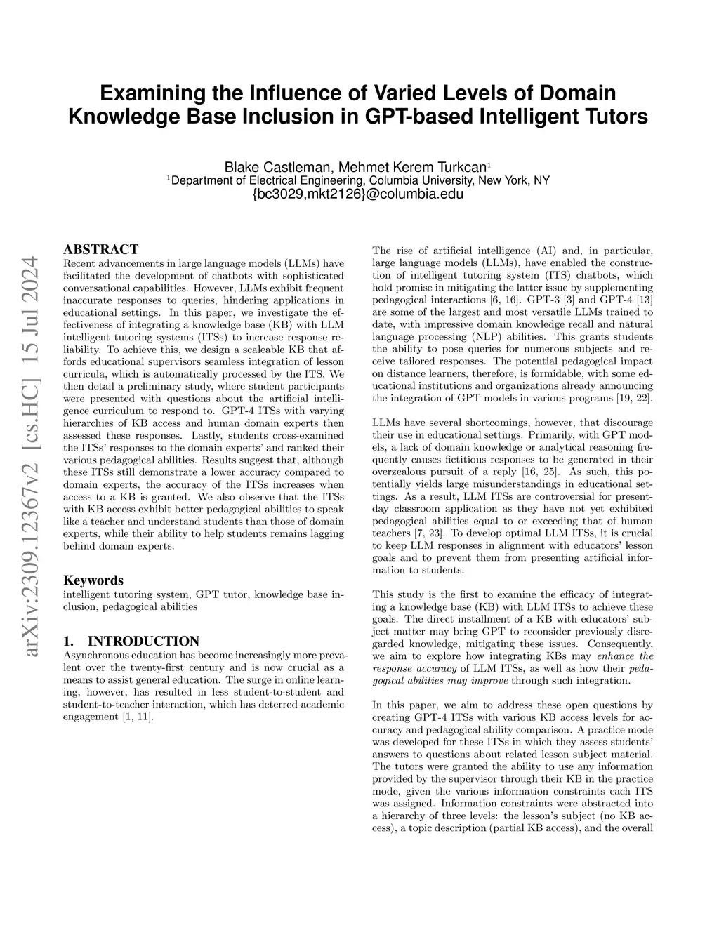Recent advancements in large language models (LLMs) have facilitated the development of chatbots with sophisticated conversational capabilities. However, LLMs exhibit frequent inaccurate responses to queries, hindering applications in educational settings. In this paper, we investigate the effectiveness of integrating a knowledge base (KB) with LLM intelligent tutors to increase response reliability. To achieve this, we design a scaleable KB that affords educational supervisors seamless integration of lesson curricula, which is automatically processed by the intelligent tutoring system. We then detail an evaluation, where student participants were presented with questions about the artificial intelligence curriculum to respond to. GPT-4 intelligent tutors with varying hierarchies of KB access and human domain experts then assessed these responses. Lastly, students cross-examined the intelligent tutors' responses to the domain experts' and ranked their various pedagogical abilities. Results suggest that, although these intelligent tutors still demonstrate a lower accuracy compared to domain experts, the accuracy of the intelligent tutors increases when access to a KB is granted. We also observe that the intelligent tutors with KB access exhibit better pedagogical abilities to speak like a teacher and understand students than those of domain experts, while their ability to help students remains lagging behind domain experts.