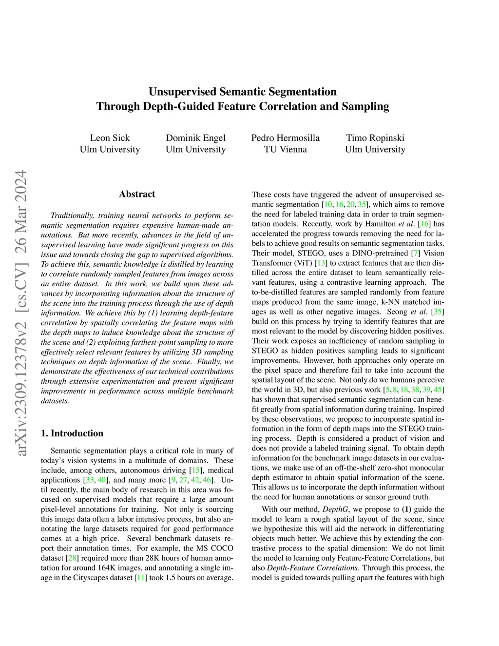 Traditionally, training neural networks to perform semantic segmentation required expensive human-made annotations. But more recently, advances in the field of unsupervised learning have made significant progress on this issue and towards closing the gap to supervised algorithms. To achieve this, semantic knowledge is distilled by learning to correlate randomly sampled features from images across an entire dataset. In this work, we build upon these advances by incorporating information about the structure of the scene into the training process through the use of depth information. We achieve this by (1) learning depth-feature correlation by spatially correlate the feature maps with the depth maps to induce knowledge about the structure of the scene and (2) implementing farthest-point sampling to more effectively select relevant features by utilizing 3D sampling techniques on depth information of the scene. Finally, we demonstrate the effectiveness of our technical contributions through extensive experimentation and present significant improvements in performance across multiple benchmark datasets.