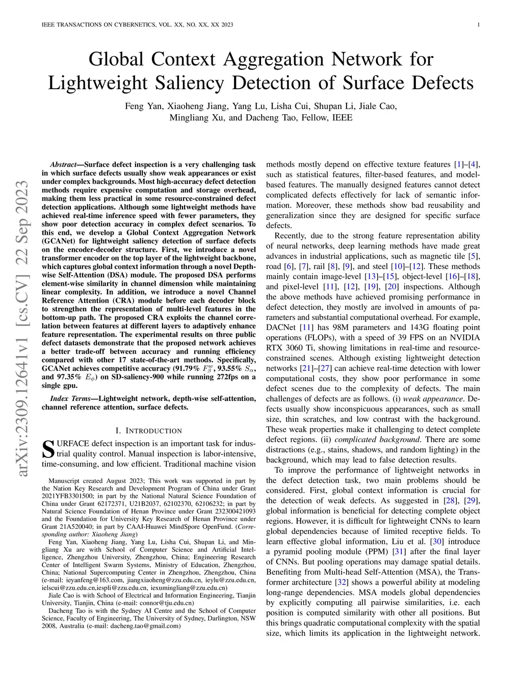 Surface defect inspection is a very challenging task in which surface defects usually show weak appearances or exist under complex backgrounds. Most high-accuracy defect detection methods require expensive computation and storage overhead, making them less practical in some resource-constrained defect detection applications. Although some lightweight methods have achieved real-time inference speed with fewer parameters, they show poor detection accuracy in complex defect scenarios. To this end, we develop a Global Context Aggregation Network (GCANet) for lightweight saliency detection of surface defects on the encoder-decoder structure. First, we introduce a novel transformer encoder on the top layer of the lightweight backbone, which captures global context information through a novel Depth-wise Self-Attention (DSA) module. The proposed DSA performs element-wise similarity in channel dimension while maintaining linear complexity. In addition, we introduce a novel Channel Reference Attention (CRA) module before each decoder block to strengthen the representation of multi-level features in the bottom-up path. The proposed CRA exploits the channel correlation between features at different layers to adaptively enhance feature representation. The experimental results on three public defect datasets demonstrate that the proposed network achieves a better trade-off between accuracy and running efficiency compared with other 17 state-of-the-art methods. Specifically, GCANet achieves competitive accuracy (91.79% , 93.55% , and 97.35% ) on SD-saliency-900 while running 272fps on a single gpu.