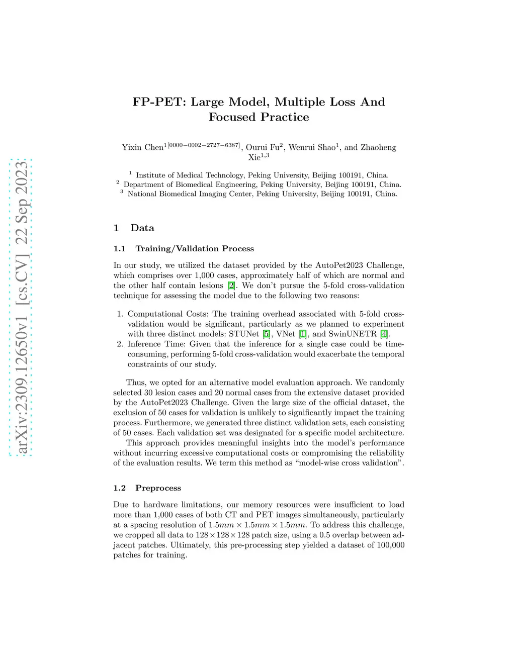 This study presents FP-PET, a comprehensive approach to medical image segmentation with a focus on CT and PET images. Utilizing a dataset from the AutoPet2023 Challenge, the research employs a variety of machine learning models, including STUNet-large, SwinUNETR, and VNet, to achieve state-of-the-art segmentation performance. The paper introduces an aggregated score that combines multiple evaluation metrics such as Dice score, false positive volume (FPV), and false negative volume (FNV) to provide a holistic measure of model effectiveness. The study also discusses the computational challenges and solutions related to model training, which was conducted on high-performance GPUs. Preprocessing and postprocessing techniques, including gaussian weighting schemes and morphological operations, are explored to further refine the segmentation output. The research offers valuable insights into the challenges and solutions for advanced medical image segmentation.