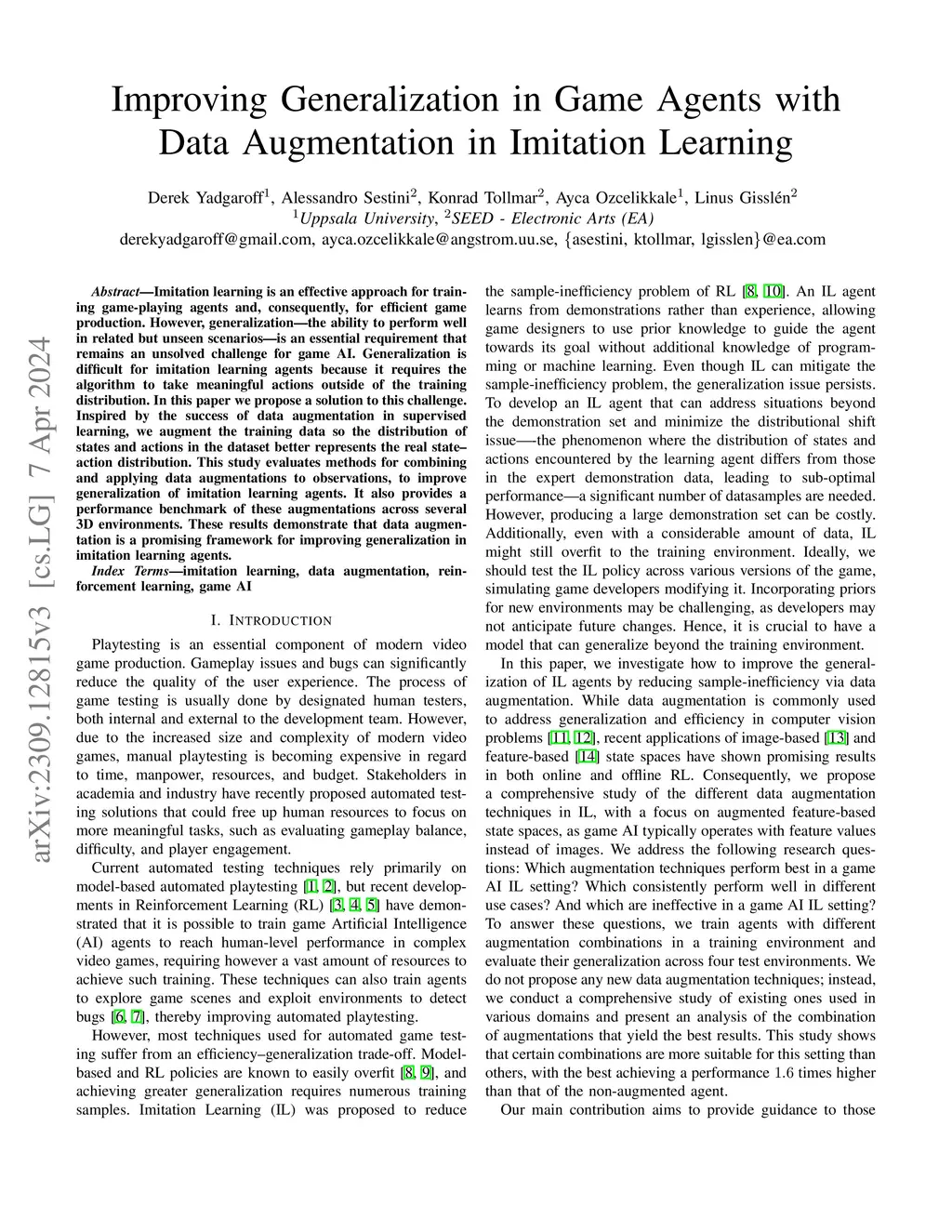 Improving Generalization in Game Agents with Data Augmentation in