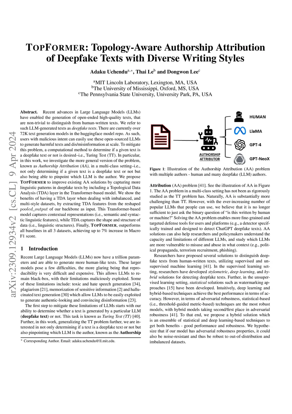 Recent advances in Large Language Models (LLMs) have enabled the generation of open-ended high-quality texts, that are non-trivial to distinguish from human-written texts. We refer to such LLM-generated texts as deepfake texts. There are currently over 72K text generation models in the huggingface model repo. As such, users with malicious intent can easily use these open-sourced LLMs to generate harmful texts and dis/misinformation at scale. To mitigate this problem, a computational method to determine if a given text is a deepfake text or not is desired--i.e., Turing Test (TT). In particular, in this work, we investigate the more general version of the problem, known as Authorship Attribution (AA), in a multi-class setting--i.e., not only determining if a given text is a deepfake text or not but also being able to pinpoint which LLM is the author. We propose TopFormer to improve existing AA solutions by capturing more linguistic patterns in deepfake texts by including a Topological Data Analysis (TDA) layer in the Transformer-based model. We show the benefits of having a TDA layer when dealing with imbalanced, and multi-style datasets, by extracting TDA features from the reshaped of our backbone as input. This Transformer-based model captures contextual representations (i.e., semantic and syntactic linguistic features), while TDA captures the shape and structure of data (i.e., linguistic structures). Finally, TopFormer, outperforms all baselines in all 3 datasets, achieving up to 7\% increase in Macro F1 score.