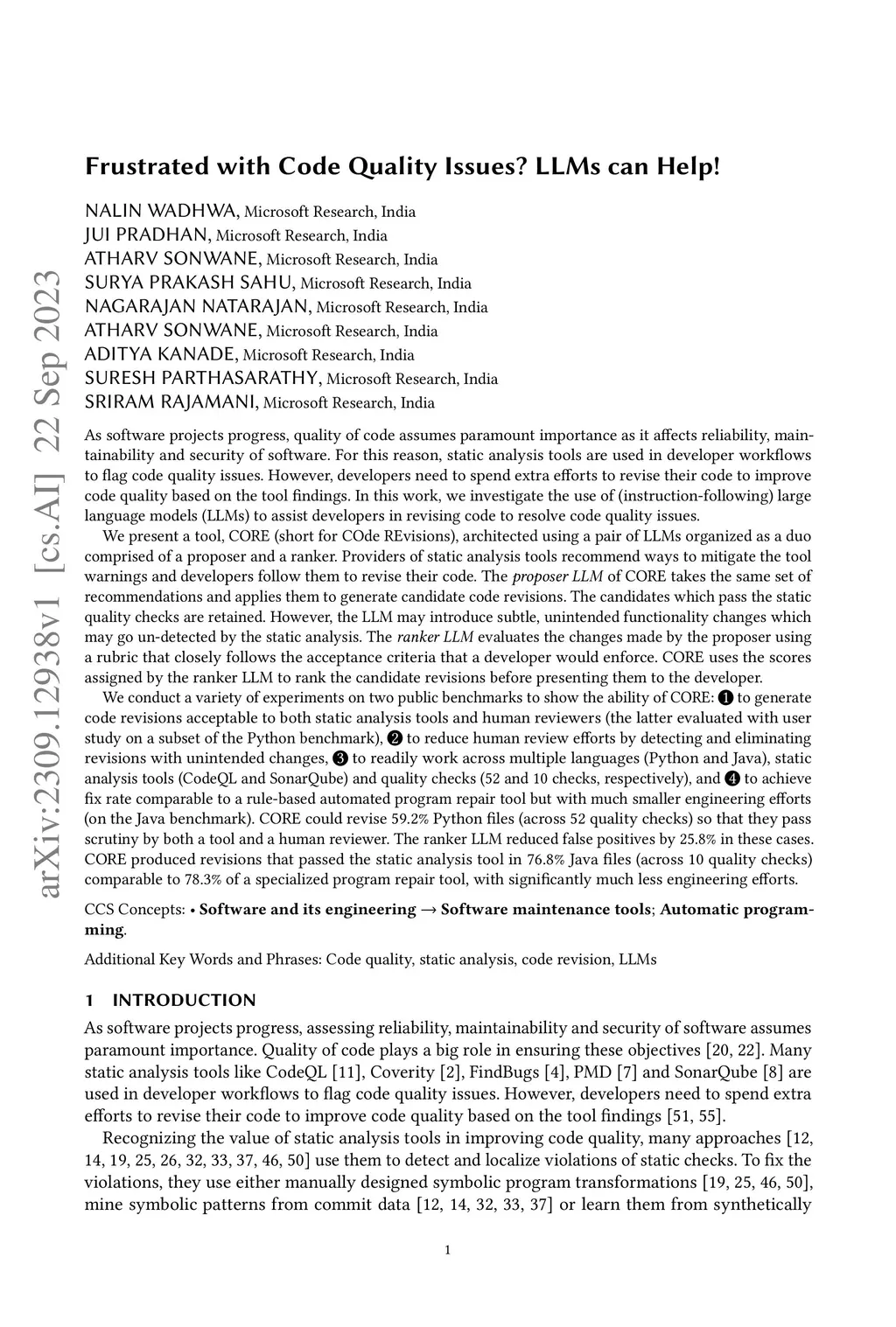 As software projects progress, quality of code assumes paramount importance as it affects reliability, maintainability and security of software. For this reason, static analysis tools are used in developer workflows to flag code quality issues. However, developers need to spend extra efforts to revise their code to improve code quality based on the tool findings. In this work, we investigate the use of (instruction-following) large language models (LLMs) to assist developers in revising code to resolve code quality issues. We present a tool, CORE (short for COde REvisions), architected using a pair of LLMs organized as a duo comprised of a proposer and a ranker. Providers of static analysis tools recommend ways to mitigate the tool warnings and developers follow them to revise their code. The \emph{proposer LLM} of CORE takes the same set of recommendations and applies them to generate candidate code revisions. The candidates which pass the static quality checks are retained. However, the LLM may introduce subtle, unintended functionality changes which may go un-detected by the static analysis. The \emph{ranker LLM} evaluates the changes made by the proposer using a rubric that closely follows the acceptance criteria that a developer would enforce. CORE uses the scores assigned by the ranker LLM to rank the candidate revisions before presenting them to the developer. CORE could revise 59.2% Python files (across 52 quality checks) so that they pass scrutiny by both a tool and a human reviewer. The ranker LLM is able to reduce false positives by 25.8% in these cases. CORE produced revisions that passed the static analysis tool in 76.8% Java files (across 10 quality checks) comparable to 78.3% of a specialized program repair tool, with significantly much less engineering efforts.