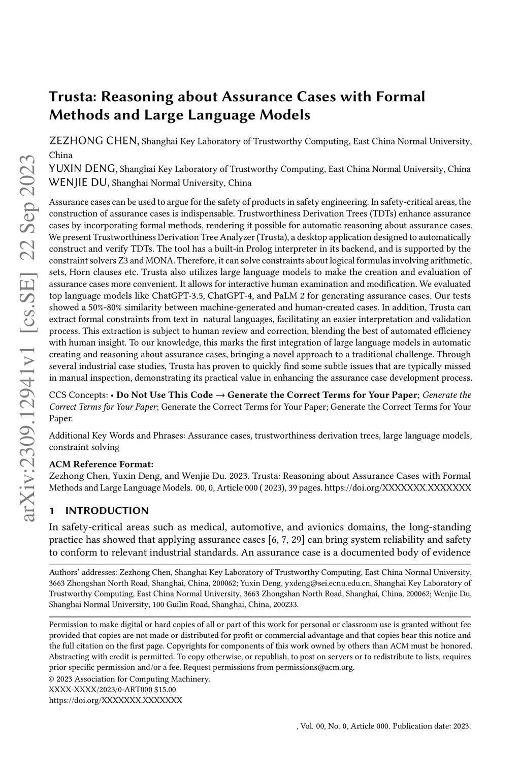 Assurance cases can be used to argue for the safety of products in safety engineering. In safety-critical areas, the construction of assurance cases is indispensable. Trustworthiness Derivation Trees (TDTs) enhance assurance cases by incorporating formal methods, rendering it possible for automatic reasoning about assurance cases. We present Trustworthiness Derivation Tree Analyzer (Trusta), a desktop application designed to automatically construct and verify TDTs. The tool has a built-in Prolog interpreter in its backend, and is supported by the constraint solvers Z3 and MONA. Therefore, it can solve constraints about logical formulas involving arithmetic, sets, Horn clauses etc. Trusta also utilizes large language models to make the creation and evaluation of assurance cases more convenient. It allows for interactive human examination and modification. We evaluated top language models like ChatGPT-3.5, ChatGPT-4, and PaLM 2 for generating assurance cases. Our tests showed a 50%-80% similarity between machine-generated and human-created cases. In addition, Trusta can extract formal constraints from text in natural languages, facilitating an easier interpretation and validation process. This extraction is subject to human review and correction, blending the best of automated efficiency with human insight. To our knowledge, this marks the first integration of large language models in automatic creating and reasoning about assurance cases, bringing a novel approach to a traditional challenge. Through several industrial case studies, Trusta has proven to quickly find some subtle issues that are typically missed in manual inspection, demonstrating its practical value in enhancing the assurance case development process.
