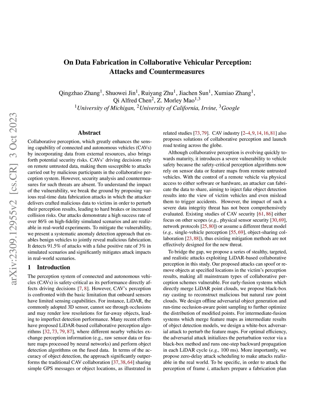 Collaborative perception, which greatly enhances the sensing capability of connected and autonomous vehicles (CAVs) by incorporating data from external resources, also brings forth potential security risks. CAVs' driving decisions rely on remote untrusted data, making them susceptible to attacks carried out by malicious participants in the collaborative perception system. However, security analysis and countermeasures for such threats are absent. To understand the impact of the vulnerability, we break the ground by proposing various real-time data fabrication attacks in which the attacker delivers crafted malicious data to victims in order to perturb their perception results, leading to hard brakes or increased collision risks. Our attacks demonstrate a high success rate of over 86% on high-fidelity simulated scenarios and are realizable in real-world experiments. To mitigate the vulnerability, we present a systematic anomaly detection approach that enables benign vehicles to jointly reveal malicious fabrication. It detects 91.5% of attacks with a false positive rate of 3% in simulated scenarios and significantly mitigates attack impacts in real-world scenarios.
