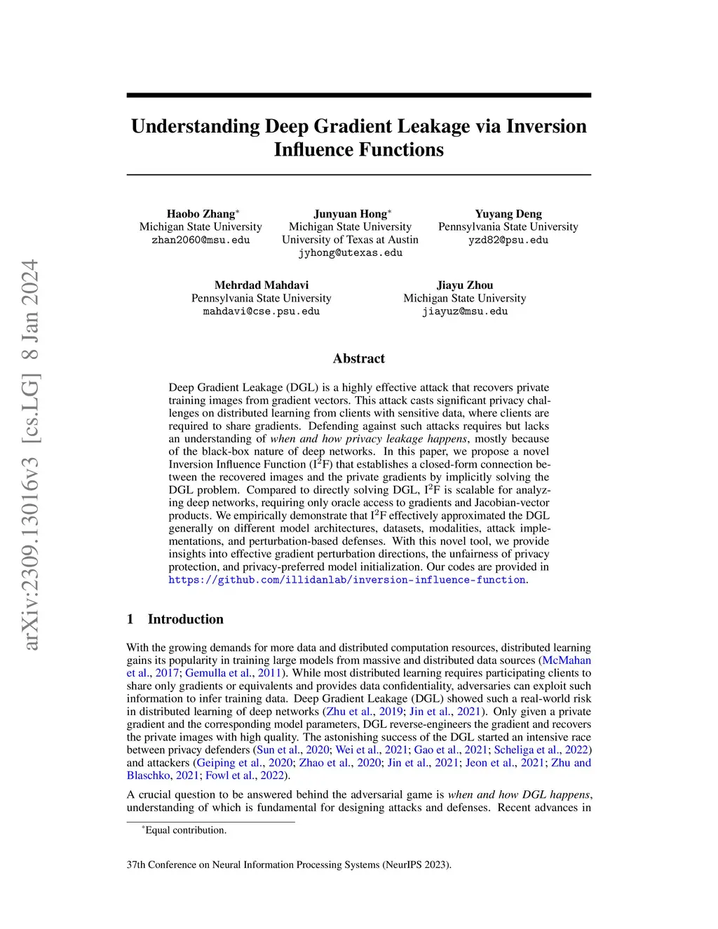 Deep Gradient Leakage (DGL) is a highly effective attack that recovers private training images from gradient vectors. This attack casts significant privacy challenges on distributed learning from clients with sensitive data, where clients are required to share gradients. Defending against such attacks requires but lacks an understanding of when and how privacy leakage happens, mostly because of the black-box nature of deep networks. In this paper, we propose a novel Inversion Influence Function (IF) that establishes a closed-form connection between the recovered images and the private gradients by implicitly solving the DGL problem. Compared to directly solving DGL, IF is scalable for analyzing deep networks, requiring only oracle access to gradients and Jacobian-vector products. We empirically demonstrate that IF effectively approximated the DGL generally on different model architectures, datasets, modalities, attack implementations, and perturbation-based defenses. With this novel tool, we provide insights into effective gradient perturbation directions, the unfairness of privacy protection, and privacy-preferred model initialization. Our codes are provided in https://github.com/illidanlab/inversion-influence-function.