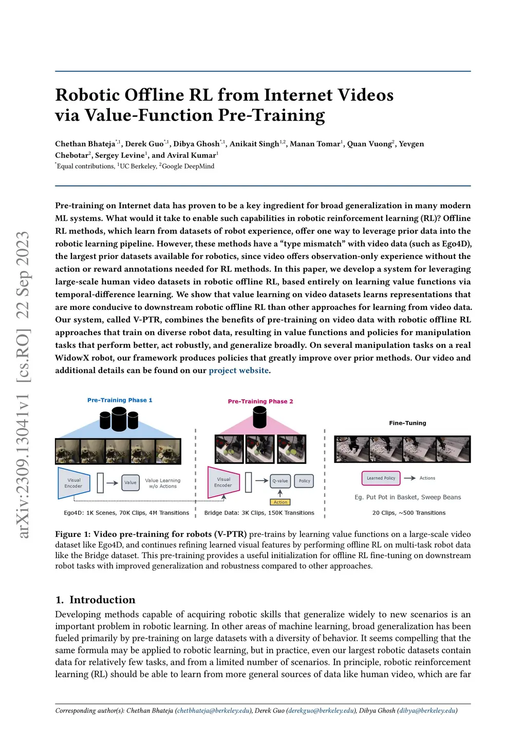 Pre-training on Internet data has proven to be a key ingredient for broad generalization in many modern ML systems. What would it take to enable such capabilities in robotic reinforcement learning (RL)? Offline RL methods, which learn from datasets of robot experience, offer one way to leverage prior data into the robotic learning pipeline. However, these methods have a "type mismatch" with video data (such as Ego4D), the largest prior datasets available for robotics, since video offers observation-only experience without the action or reward annotations needed for RL methods. In this paper, we develop a system for leveraging large-scale human video datasets in robotic offline RL, based entirely on learning value functions via temporal-difference learning. We show that value learning on video datasets learns representations that are more conducive to downstream robotic offline RL than other approaches for learning from video data. Our system, called V-PTR, combines the benefits of pre-training on video data with robotic offline RL approaches that train on diverse robot data, resulting in value functions and policies for manipulation tasks that perform better, act robustly, and generalize broadly. On several manipulation tasks on a real WidowX robot, our framework produces policies that greatly improve over prior methods. Our video and additional details can be found at https://dibyaghosh.com/vptr/
