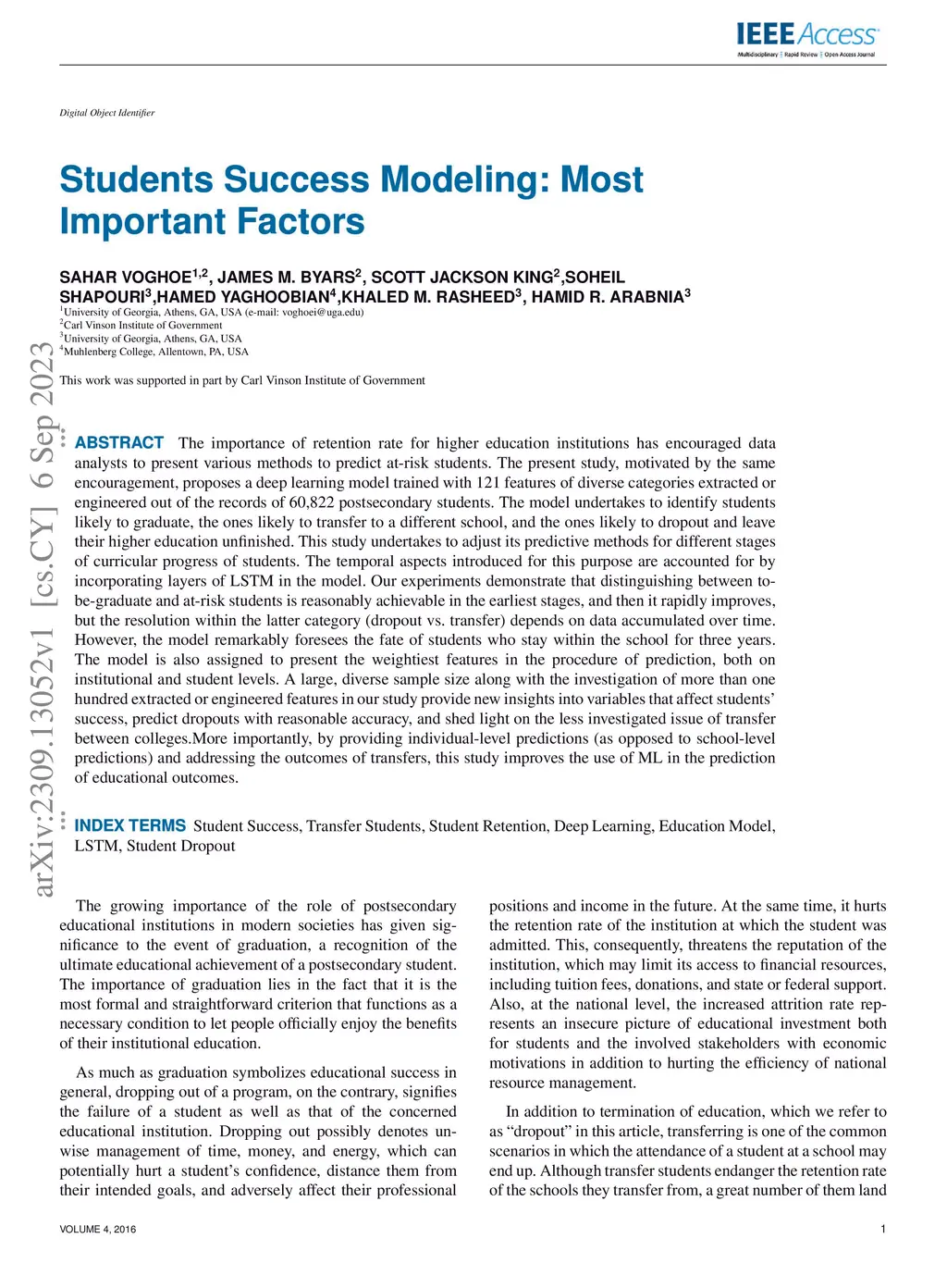 The importance of retention rate for higher education institutions has encouraged data analysts to present various methods to predict at-risk students. The present study, motivated by the same encouragement, proposes a deep learning model trained with 121 features of diverse categories extracted or engineered out of the records of 60,822 postsecondary students. The model undertakes to identify students likely to graduate, the ones likely to transfer to a different school, and the ones likely to drop out and leave their higher education unfinished. This study undertakes to adjust its predictive methods for different stages of curricular progress of students. The temporal aspects introduced for this purpose are accounted for by incorporating layers of LSTM in the model. Our experiments demonstrate that distinguishing between to-be-graduate and at-risk students is reasonably achievable in the earliest stages, and then it rapidly improves, but the resolution within the latter category (dropout vs. transfer) depends on data accumulated over time. However, the model remarkably foresees the fate of students who stay in the school for three years. The model is also assigned to present the weightiest features in the procedure of prediction, both on institutional and student levels. A large, diverse sample size along with the investigation of more than one hundred extracted or engineered features in our study provide new insights into variables that affect students success, predict dropouts with reasonable accuracy, and shed light on the less investigated issue of transfer between colleges. More importantly, by providing individual-level predictions (as opposed to school-level predictions) and addressing the outcomes of transfers, this study improves the use of ML in the prediction of educational outcomes.