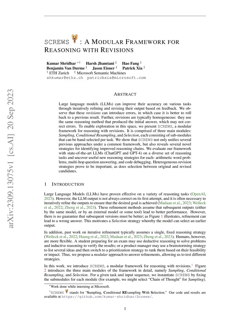 Large language models (LLMs) can improve their accuracy on various tasks through iteratively refining and revising their output based on feedback. We observe that these revisions can introduce errors, in which case it is better to roll back to a previous result. Further, revisions are typically homogeneous: they use the same reasoning method that produced the initial answer, which may not correct errors. To enable exploration in this space, we present SCREWS, a modular framework for reasoning with revisions. It is comprised of three main modules: Sampling, Conditional Resampling, and Selection, each consisting of sub-modules that can be hand-selected per task. We show that SCREWS not only unifies several previous approaches under a common framework, but also reveals several novel strategies for identifying improved reasoning chains. We evaluate our framework with state-of-the-art LLMs (ChatGPT and GPT-4) on a diverse set of reasoning tasks and uncover useful new reasoning strategies for each: arithmetic word problems, multi-hop question answering, and code debugging. Heterogeneous revision strategies prove to be important, as does selection between original and revised candidates.