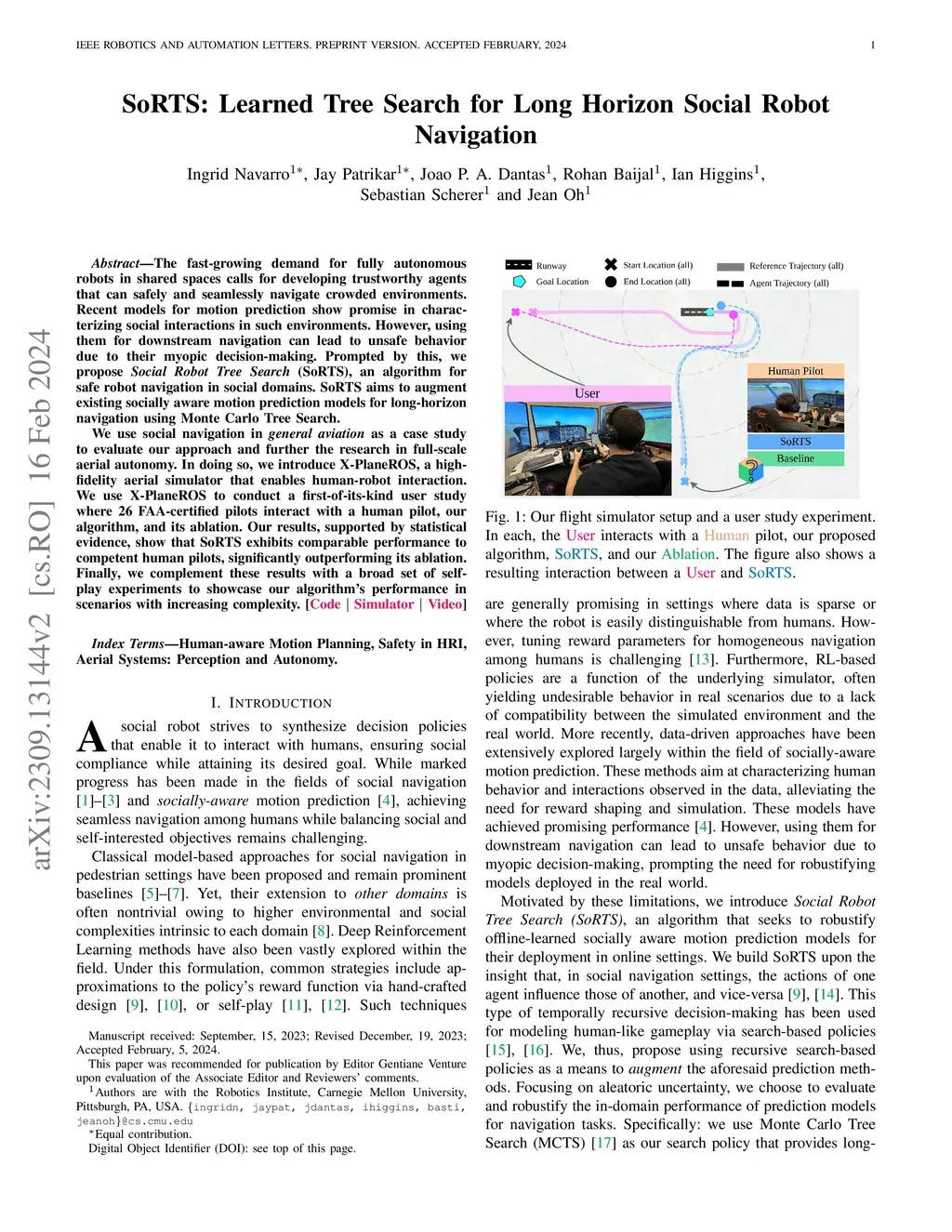 The fast-growing demand for fully autonomous robots in shared spaces calls for the development of trustworthy agents that can safely and seamlessly navigate in crowded environments. Recent models for motion prediction show promise in characterizing social interactions in such environments. Still, adapting them for navigation is challenging as they often suffer from generalization failures. Prompted by this, we propose Social Robot Tree Search (SoRTS), an algorithm for safe robot navigation in social domains. SoRTS aims to augment existing socially aware motion prediction models for long-horizon navigation using Monte Carlo Tree Search. We use social navigation in general aviation as a case study to evaluate our approach and further the research in full-scale aerial autonomy. In doing so, we introduce XPlaneROS, a high-fidelity aerial simulator that enables human-robot interaction. We use XPlaneROS to conduct a first-of-its-kind user study where 26 FAA-certified pilots interact with a human pilot, our algorithm, and its ablation. Our results, supported by statistical evidence, show that SoRTS exhibits a comparable performance to competent human pilots, significantly outperforming its ablation. Finally, we complement these results with a broad set of self-play experiments to showcase our algorithm's performance in scenarios with increasing complexity.