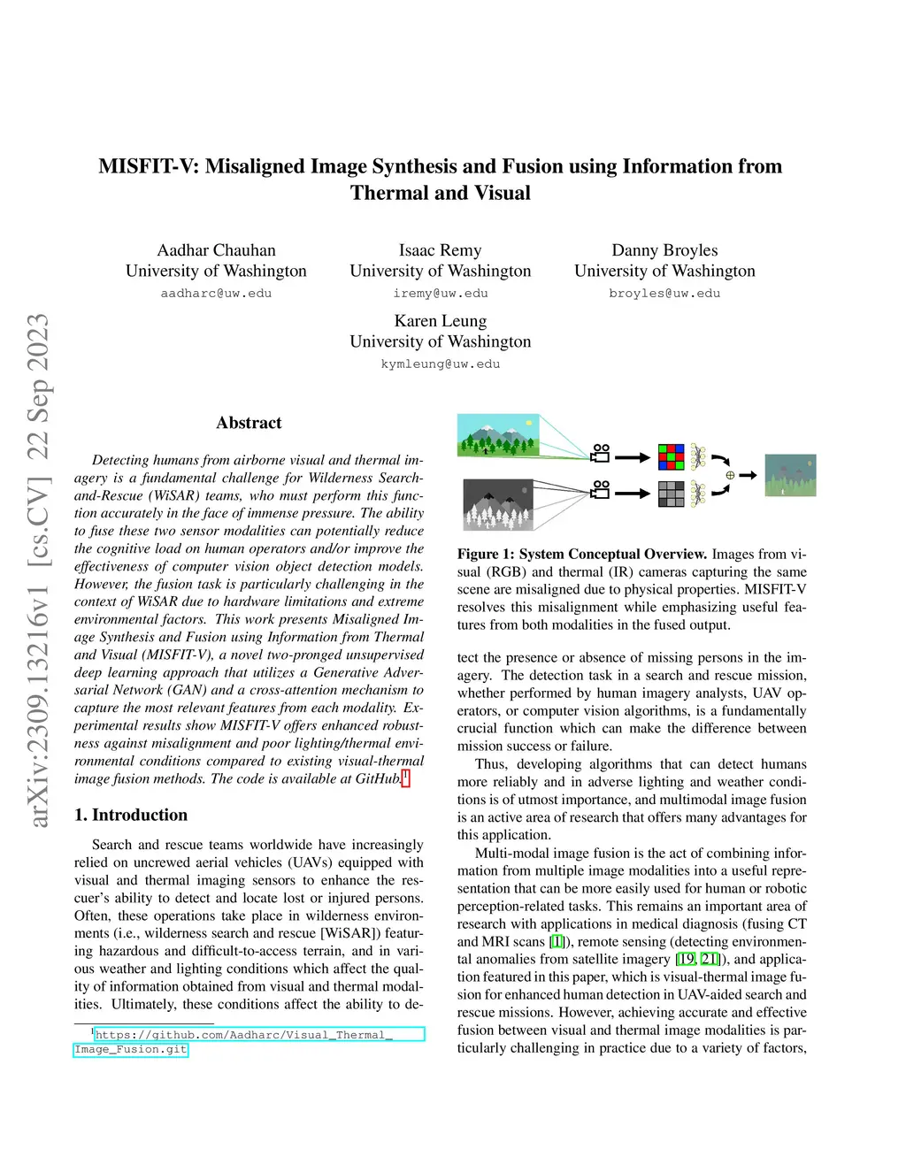 Detecting humans from airborne visual and thermal imagery is a fundamental challenge for Wilderness Search-and-Rescue (WiSAR) teams, who must perform this function accurately in the face of immense pressure. The ability to fuse these two sensor modalities can potentially reduce the cognitive load on human operators and/or improve the effectiveness of computer vision object detection models. However, the fusion task is particularly challenging in the context of WiSAR due to hardware limitations and extreme environmental factors. This work presents Misaligned Image Synthesis and Fusion using Information from Thermal and Visual (MISFIT-V), a novel two-pronged unsupervised deep learning approach that utilizes a Generative Adversarial Network (GAN) and a cross-attention mechanism to capture the most relevant features from each modality. Experimental results show MISFIT-V offers enhanced robustness against misalignment and poor lighting/thermal environmental conditions compared to existing visual-thermal image fusion methods.
