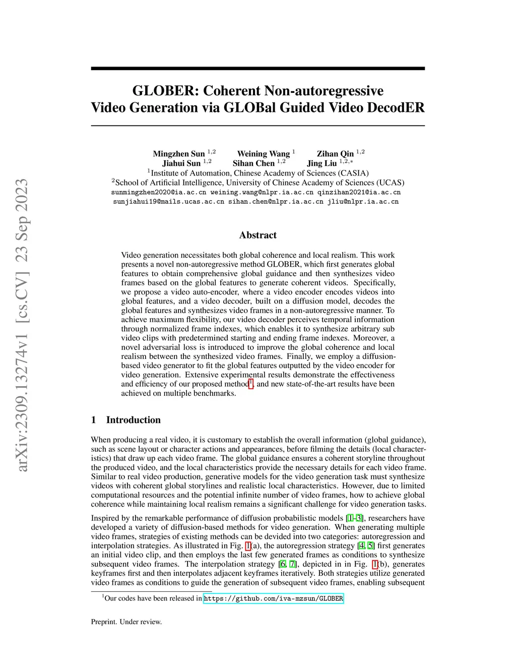 Video generation necessitates both global coherence and local realism. This work presents a novel non-autoregressive method GLOBER, which first generates global features to obtain comprehensive global guidance and then synthesizes video frames based on the global features to generate coherent videos. Specifically, we propose a video auto-encoder, where a video encoder encodes videos into global features, and a video decoder, built on a diffusion model, decodes the global features and synthesizes video frames in a non-autoregressive manner. To achieve maximum flexibility, our video decoder perceives temporal information through normalized frame indexes, which enables it to synthesize arbitrary sub video clips with predetermined starting and ending frame indexes. Moreover, a novel adversarial loss is introduced to improve the global coherence and local realism between the synthesized video frames. Finally, we employ a diffusion-based video generator to fit the global features outputted by the video encoder for video generation. Extensive experimental results demonstrate the effectiveness and efficiency of our proposed method, and new state-of-the-art results have been achieved on multiple benchmarks.