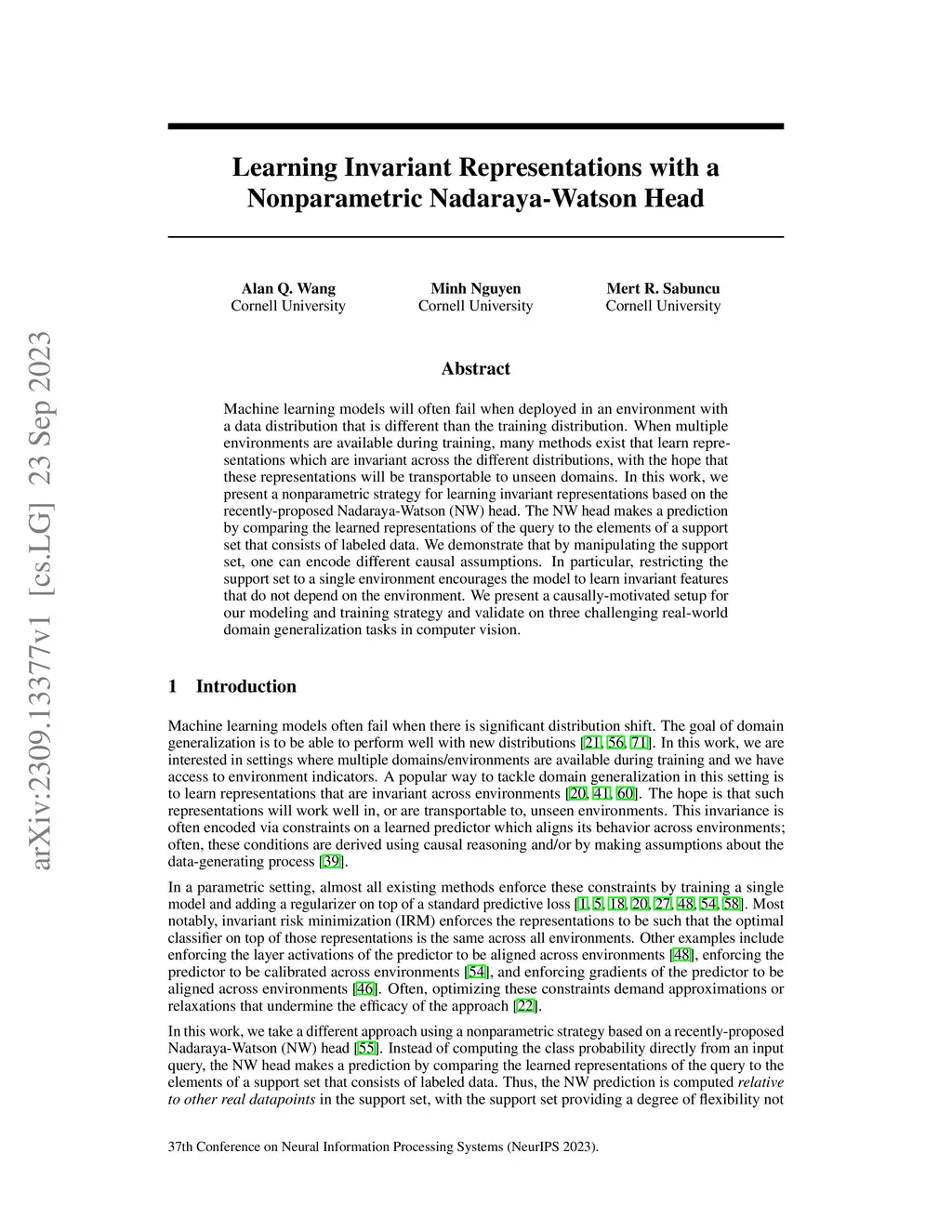 Machine learning models will often fail when deployed in an environment with a data distribution that is different than the training distribution. When multiple environments are available during training, many methods exist that learn representations which are invariant across the different distributions, with the hope that these representations will be transportable to unseen domains. In this work, we present a nonparametric strategy for learning invariant representations based on the recently-proposed Nadaraya-Watson (NW) head. The NW head makes a prediction by comparing the learned representations of the query to the elements of a support set that consists of labeled data. We demonstrate that by manipulating the support set, one can encode different causal assumptions. In particular, restricting the support set to a single environment encourages the model to learn invariant features that do not depend on the environment. We present a causally-motivated setup for our modeling and training strategy and validate on three challenging real-world domain generalization tasks in computer vision.