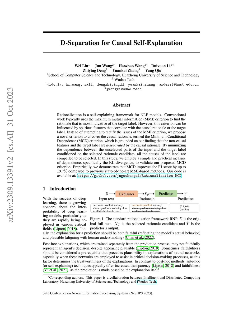 Rationalization is a self-explaining framework for NLP models. Conventional work typically uses the maximum mutual information (MMI) criterion to find the rationale that is most indicative of the target label. However, this criterion can be influenced by spurious features that correlate with the causal rationale or the target label. Instead of attempting to rectify the issues of the MMI criterion, we propose a novel criterion to uncover the causal rationale, termed the Minimum Conditional Dependence (MCD) criterion, which is grounded on our finding that the non-causal features and the target label are \emph{d-separated} by the causal rationale. By minimizing the dependence between the unselected parts of the input and the target label conditioned on the selected rationale candidate, all the causes of the label are compelled to be selected. In this study, we employ a simple and practical measure of dependence, specifically the KL-divergence, to validate our proposed MCD criterion. Empirically, we demonstrate that MCD improves the F1 score by up to compared to previous state-of-the-art MMI-based methods. Our code is available at: \url{https://github.com/jugechengzi/Rationalization-MCD}.