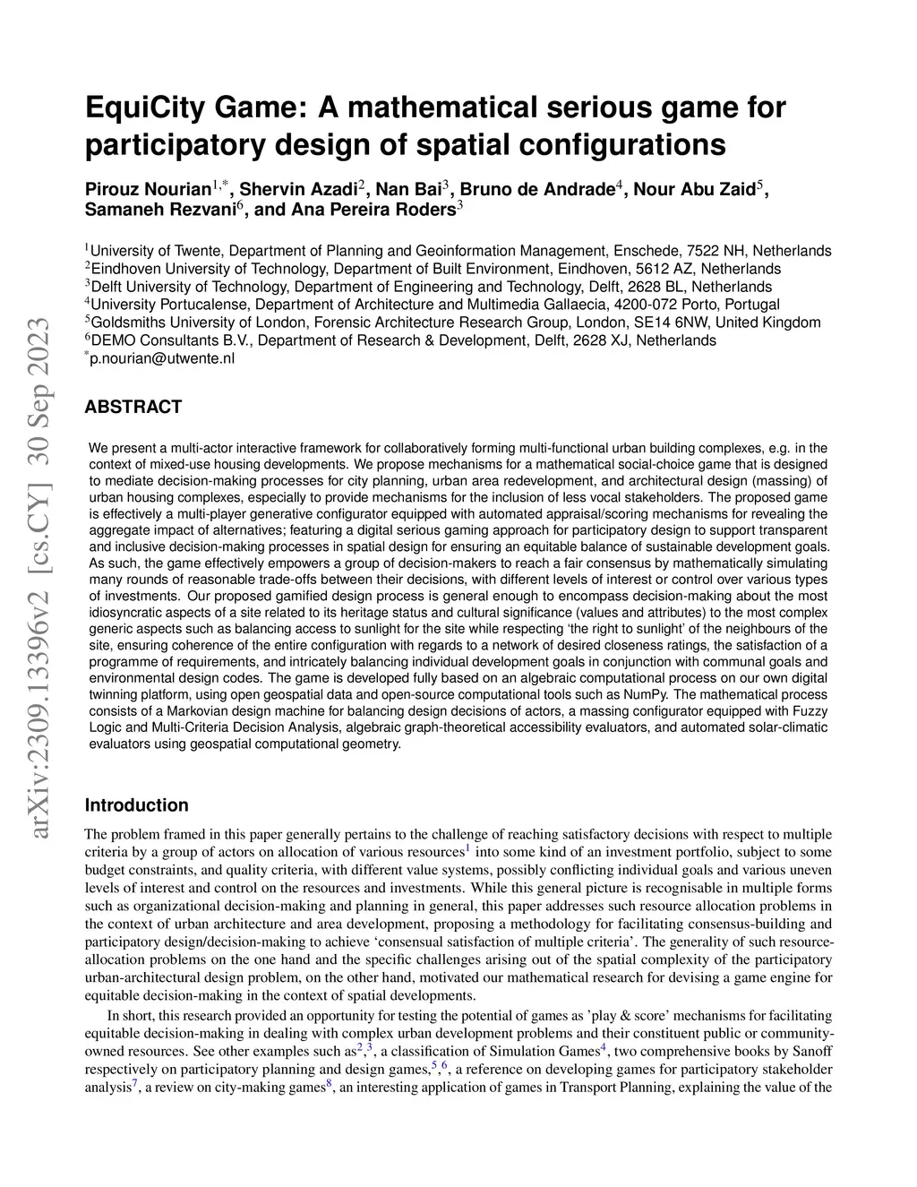 We propose mechanisms for a mathematical social-choice game that is designed to mediate decision-making processes for city planning, urban area redevelopment, and architectural design (massing) of urban housing complexes. The proposed game is effectively a multi-player generative configurator equipped with automated appraisal/scoring mechanisms for revealing the aggregate impact of alternatives; featuring a participatory digital process to support transparent and inclusive decision-making processes in spatial design for ensuring an equitable balance of sustainable development goals. As such, the game effectively empowers a group of decision-makers to reach a fair consensus by mathematically simulating many rounds of trade-offs between their decisions, with different levels of interest or control over various types of investments. Our proposed gamified design process encompasses decision-making about the most idiosyncratic aspects of a site related to its heritage status and cultural significance to the physical aspects such as balancing access to sunlight and the right to sunlight of the neighbours of the site, ensuring coherence of the entire configuration with regards to a network of desired closeness ratings, the satisfaction of a programme of requirements, and intricately balancing individual development goals in conjunction with communal goals and environmental design codes. The game is developed fully based on an algebraic computational process on our own digital twinning platform, using open geospatial data and open-source computational tools such as NumPy. The mathematical process consists of a Markovian design machine for balancing the decisions of actors, a massing configurator equipped with Fuzzy Logic and Multi-Criteria Decision Analysis, algebraic graph-theoretical accessibility evaluators, and automated solar-climatic evaluators using geospatial computational geometry.