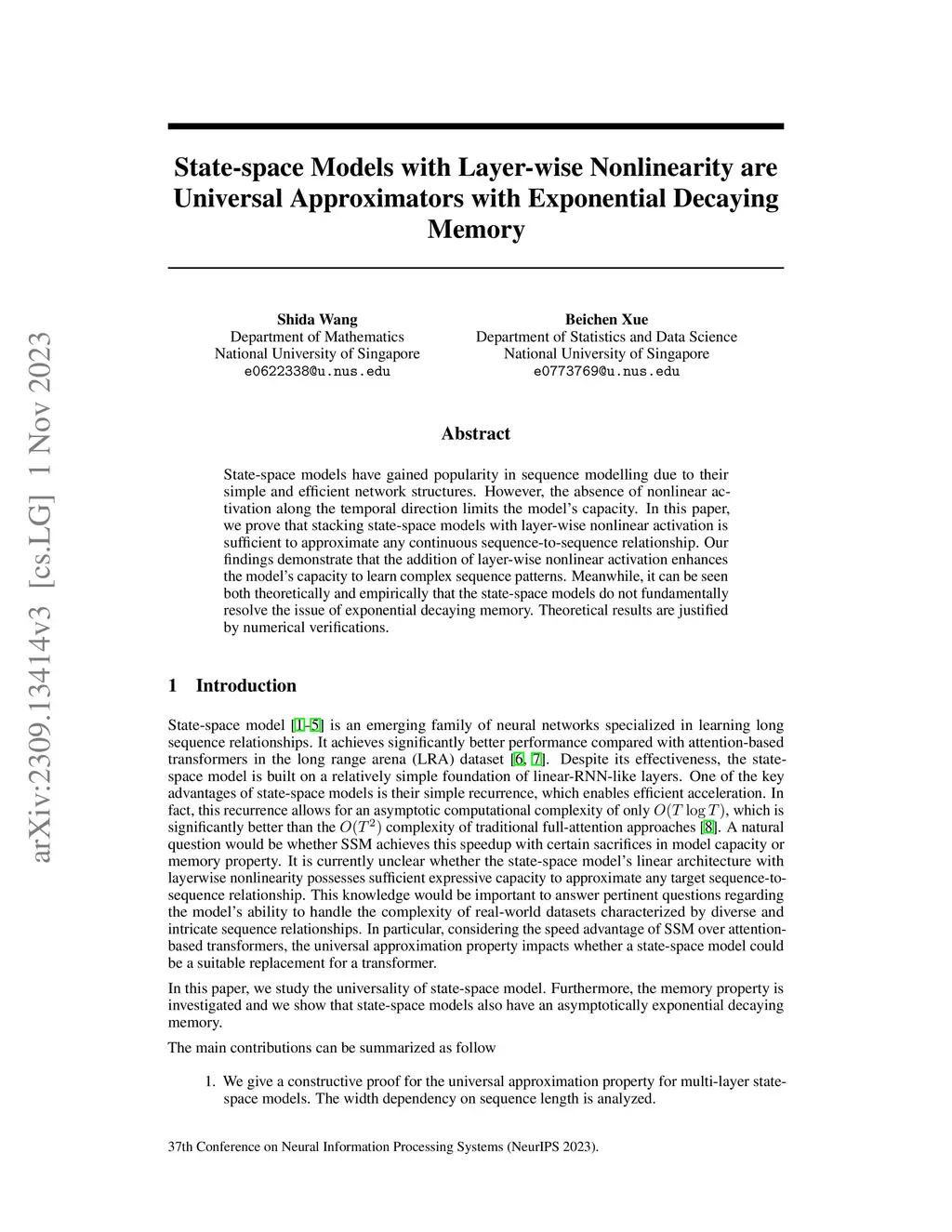 State-space models have gained popularity in sequence modelling due to their simple and efficient network structures. However, the absence of nonlinear activation along the temporal direction limits the model's capacity. In this paper, we prove that stacking state-space models with layer-wise nonlinear activation is sufficient to approximate any continuous sequence-to-sequence relationship. Our findings demonstrate that the addition of layer-wise nonlinear activation enhances the model's capacity to learn complex sequence patterns. Meanwhile, it can be seen both theoretically and empirically that the state-space models do not fundamentally resolve the issue of exponential decaying memory. Theoretical results are justified by numerical verifications.