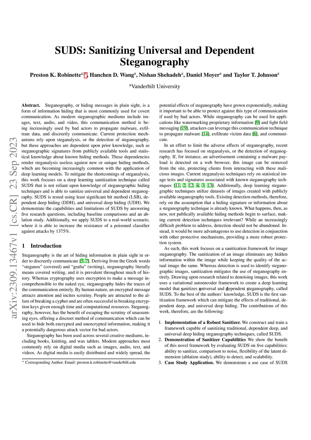 Steganography, or hiding messages in plain sight, is a form of information hiding that is most commonly used for covert communication. As modern steganographic mediums include images, text, audio, and video, this communication method is being increasingly used by bad actors to propagate malware, exfiltrate data, and discreetly communicate. Current protection mechanisms rely upon steganalysis, or the detection of steganography, but these approaches are dependent upon prior knowledge, such as steganographic signatures from publicly available tools and statistical knowledge about known hiding methods. These dependencies render steganalysis useless against new or unique hiding methods, which are becoming increasingly common with the application of deep learning models. To mitigate the shortcomings of steganalysis, this work focuses on a deep learning sanitization technique called SUDS that is not reliant upon knowledge of steganographic hiding techniques and is able to sanitize universal and dependent steganography. SUDS is tested using least significant bit method (LSB), dependent deep hiding (DDH), and universal deep hiding (UDH). We demonstrate the capabilities and limitations of SUDS by answering five research questions, including baseline comparisons and an ablation study. Additionally, we apply SUDS to a real-world scenario, where it is able to increase the resistance of a poisoned classifier against attacks by 1375%.