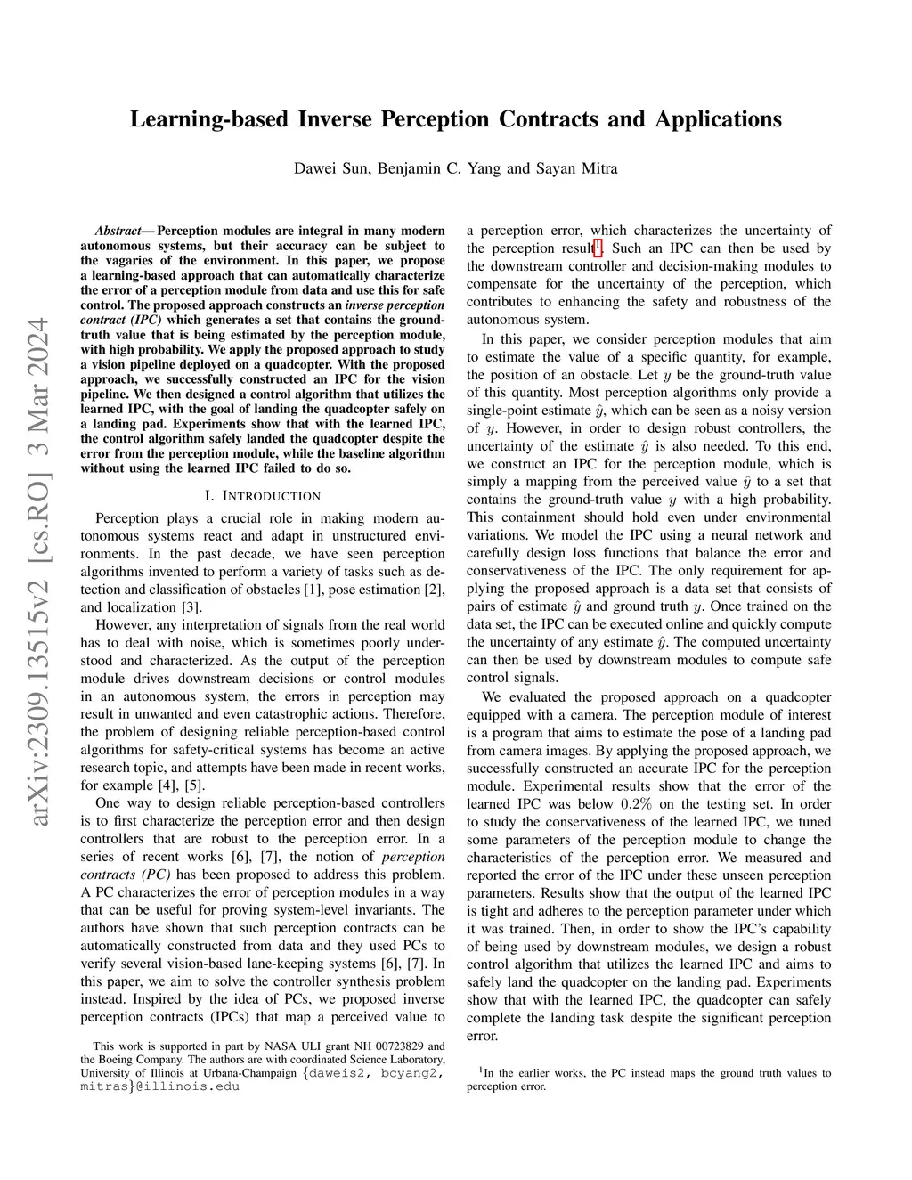 Perception modules are integral in many modern autonomous systems, but their accuracy can be subject to the vagaries of the environment. In this paper, we propose a learning-based approach that can automatically characterize the error of a perception module from data and use this for safe control. The proposed approach constructs an inverse perception contract (IPC) which generates a set that contains the ground-truth value that is being estimated by the perception module, with high probability. We apply the proposed approach to study a vision pipeline deployed on a quadcopter. With the proposed approach, we successfully constructed an IPC for the vision pipeline. We then designed a control algorithm that utilizes the learned IPC, with the goal of landing the quadcopter safely on a landing pad. Experiments show that with the learned IPC, the control algorithm safely landed the quadcopter despite the error from the perception module, while the baseline algorithm without using the learned IPC failed to do so.